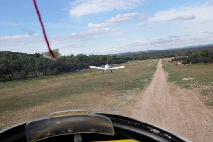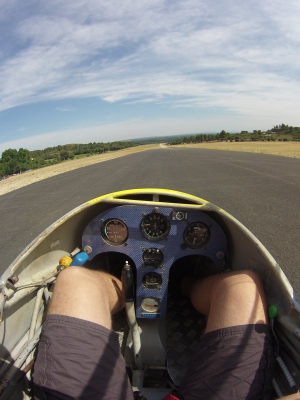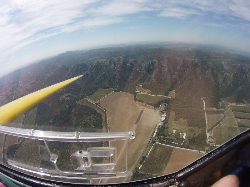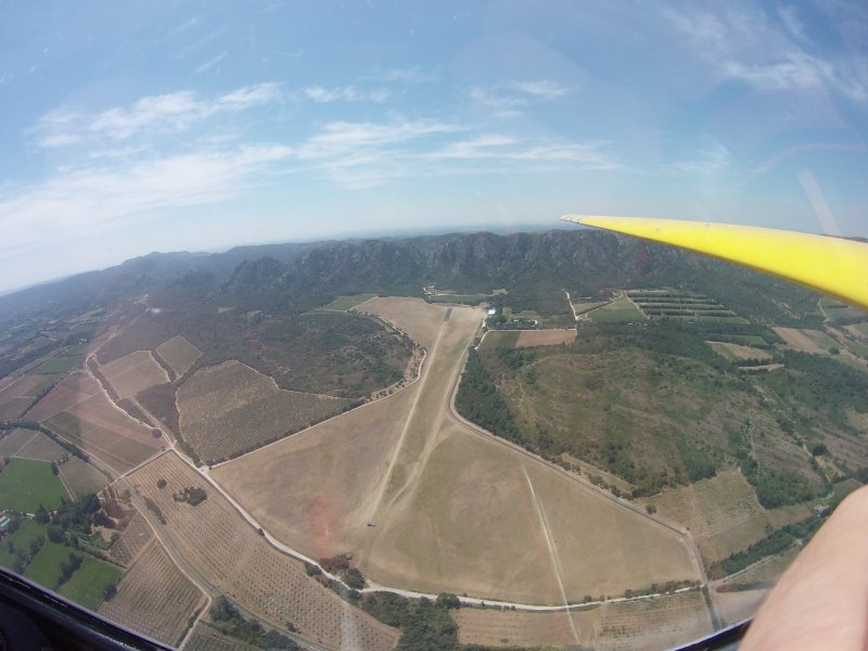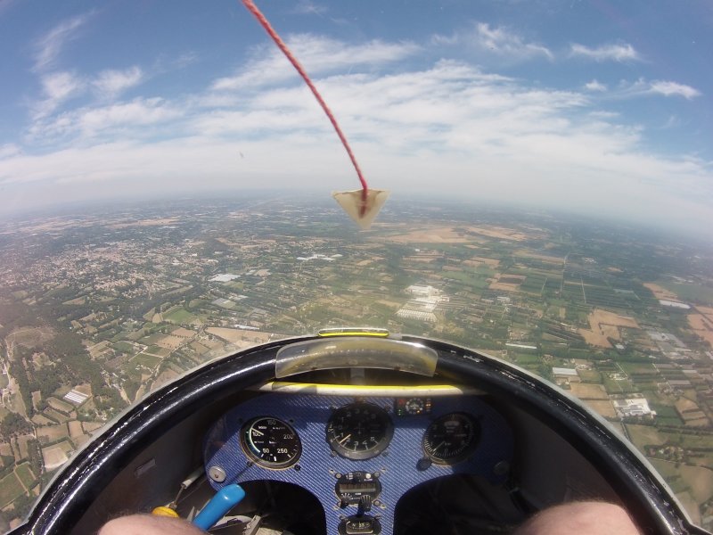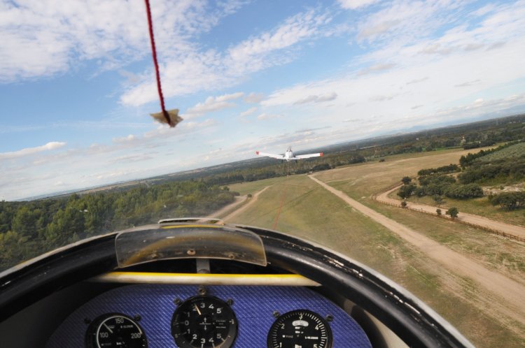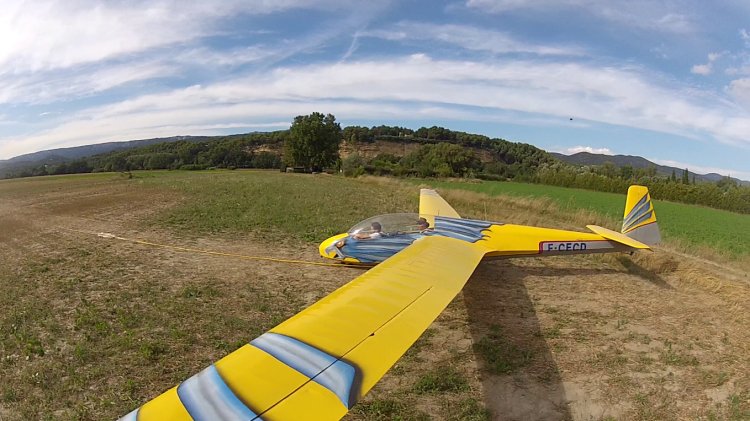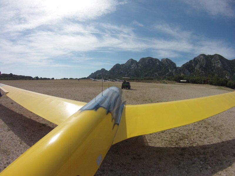 Après le briefing sécurité, celui de la machine, c'est le moment du départ ... décollage au treuil, 100 km/h en 3 secondes, c'est dynamique mais pas violent (merci à Boris qui treuille ce matin). Un Mistral qui souffle à 30 noeuds, une légère couverture d'altitude et une visibilité moyenne mais un très bon moment passé là haut ... un bon petit vol d'une heure et quart. Quelques photos et vidéo prises par Guillaume avec une petite camera grand angle ...