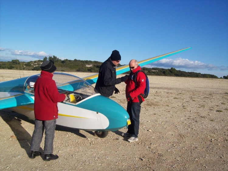Danielle et Jean Pat, des amis de longue date de Laurent, sont venus à Saint Rémy pour faire un vol en planeur. Mais pas n'importe quel vol, leur premier vol. Une froide et claire journée de décembre, un Mistral de 40 km/h, bien emitouflés nous volerons aujourd'hui sur le K13 YO. C'est Jean Pat qui partira le premier. Marie Danielle est un peu inquiète ; elle est sujette au mal de mer ... mais tout se passera très bien, Danielle et Jean Pat feront un vol en toute tranquilité, sans aucun problème ...