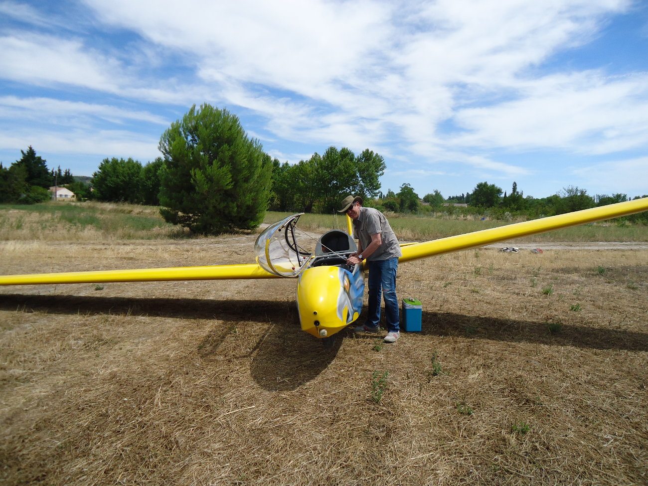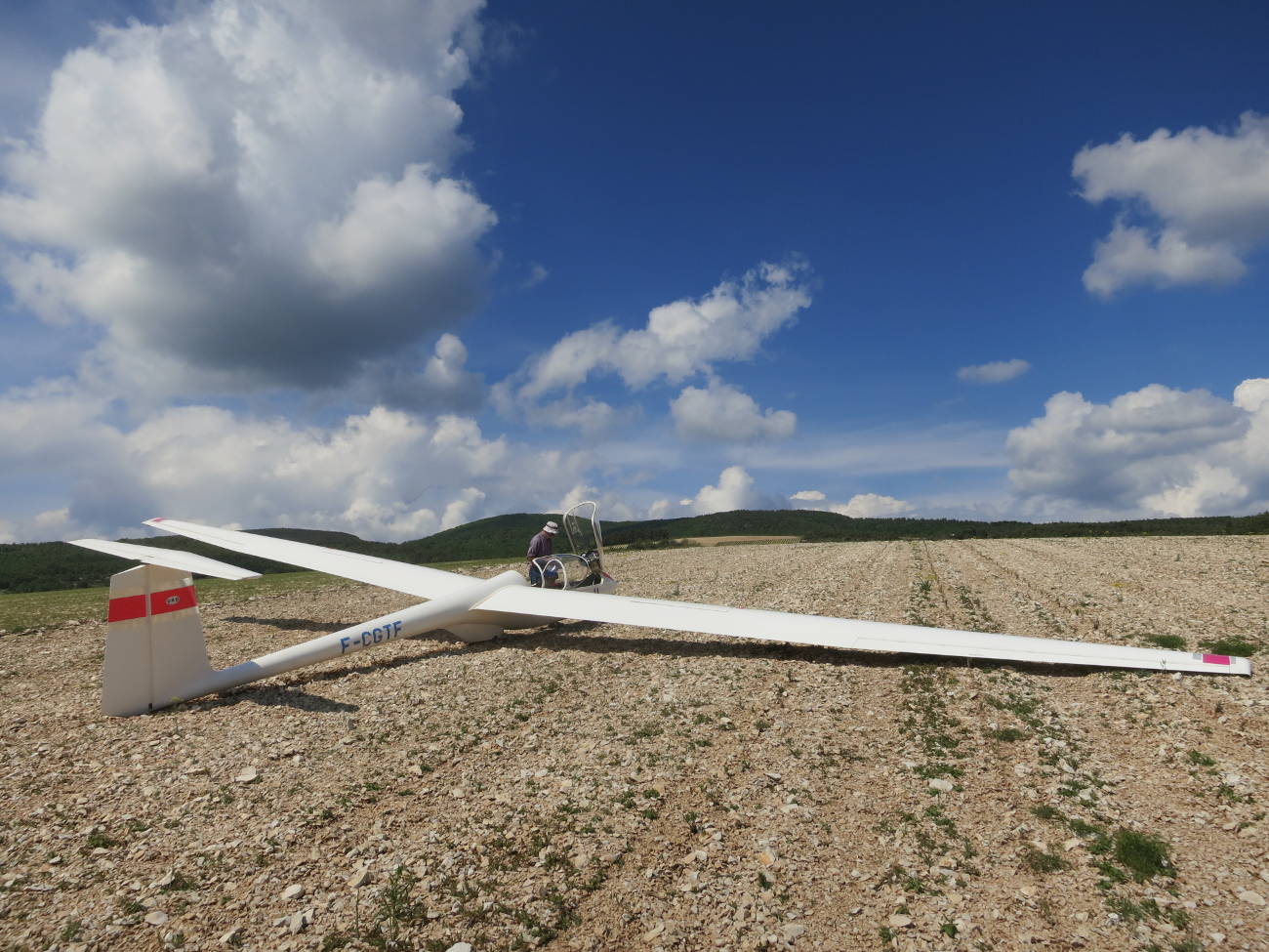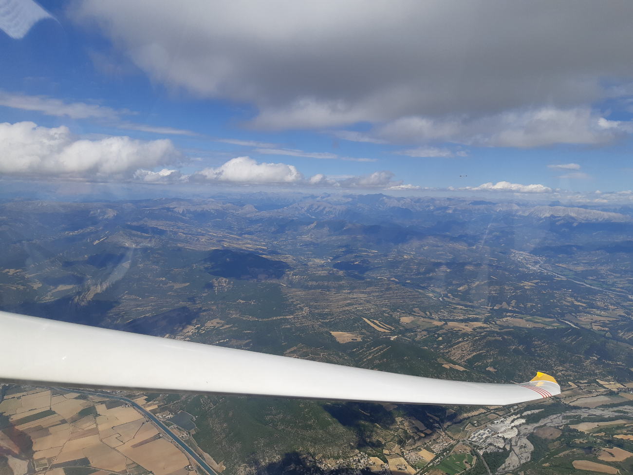Quant à Alain et Laurent, pour eux les choses se sont compliquées. Partis les derniers et trahis par un altimètre pessimiste de leur Marianne, ils ont dû prendre un 2nd départ après 1h30 de bagarre devant le plateau de St Christol. Avec plus de 2 heures de retard et après avoir tourné le 1er point de virage, les cumulus se disloquant irrémédiablement, il leur a fallu renoncer à 20 km du dernier point de virage et, devant la Motte du Caire, prendre la décision du retour sous peine de se "vacher" à Sisteron. Un retour bien géré malgré tout pour atteindre Carpentras bien après l'atterrissage des autres concurrents > 207 km seulement