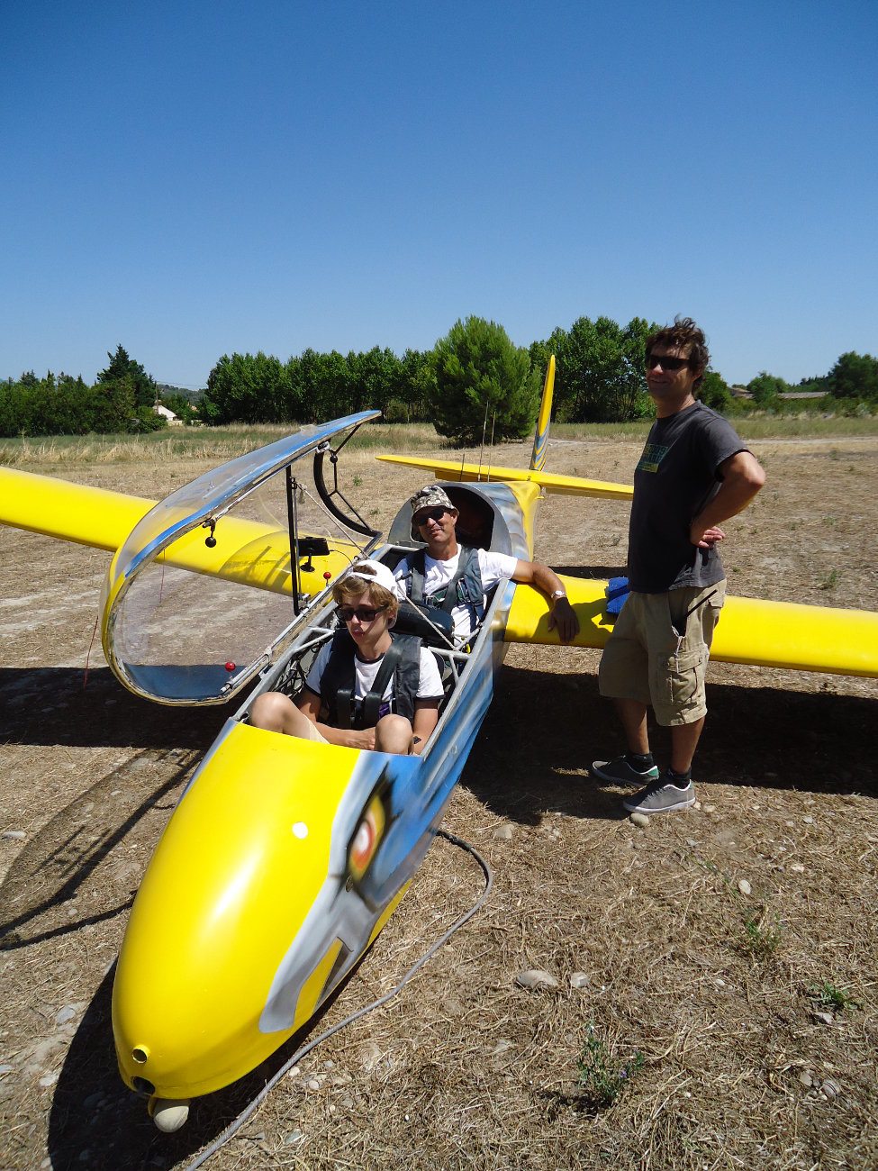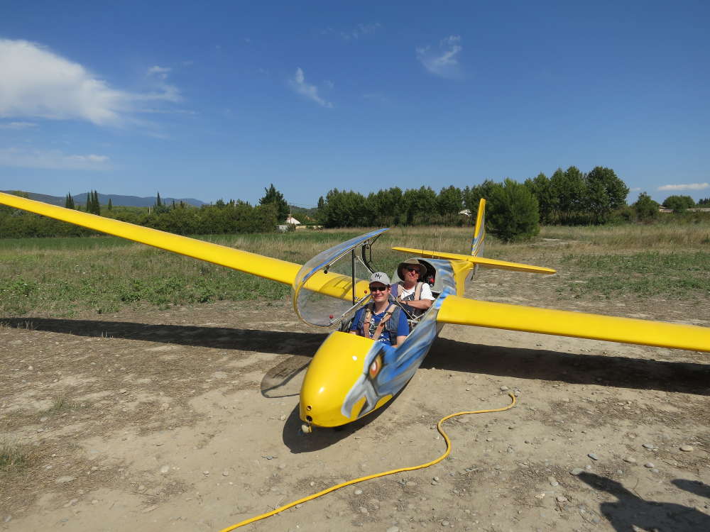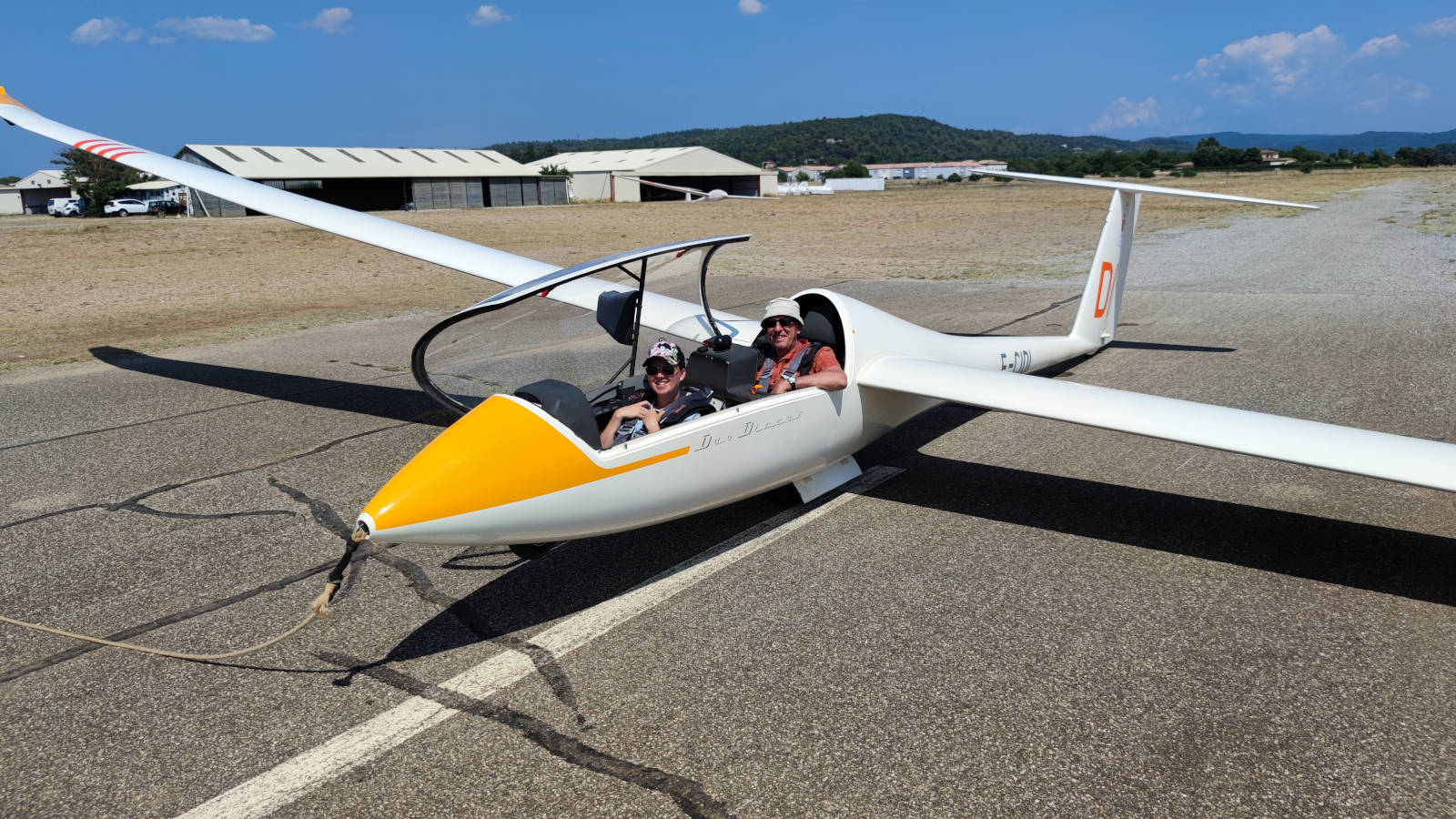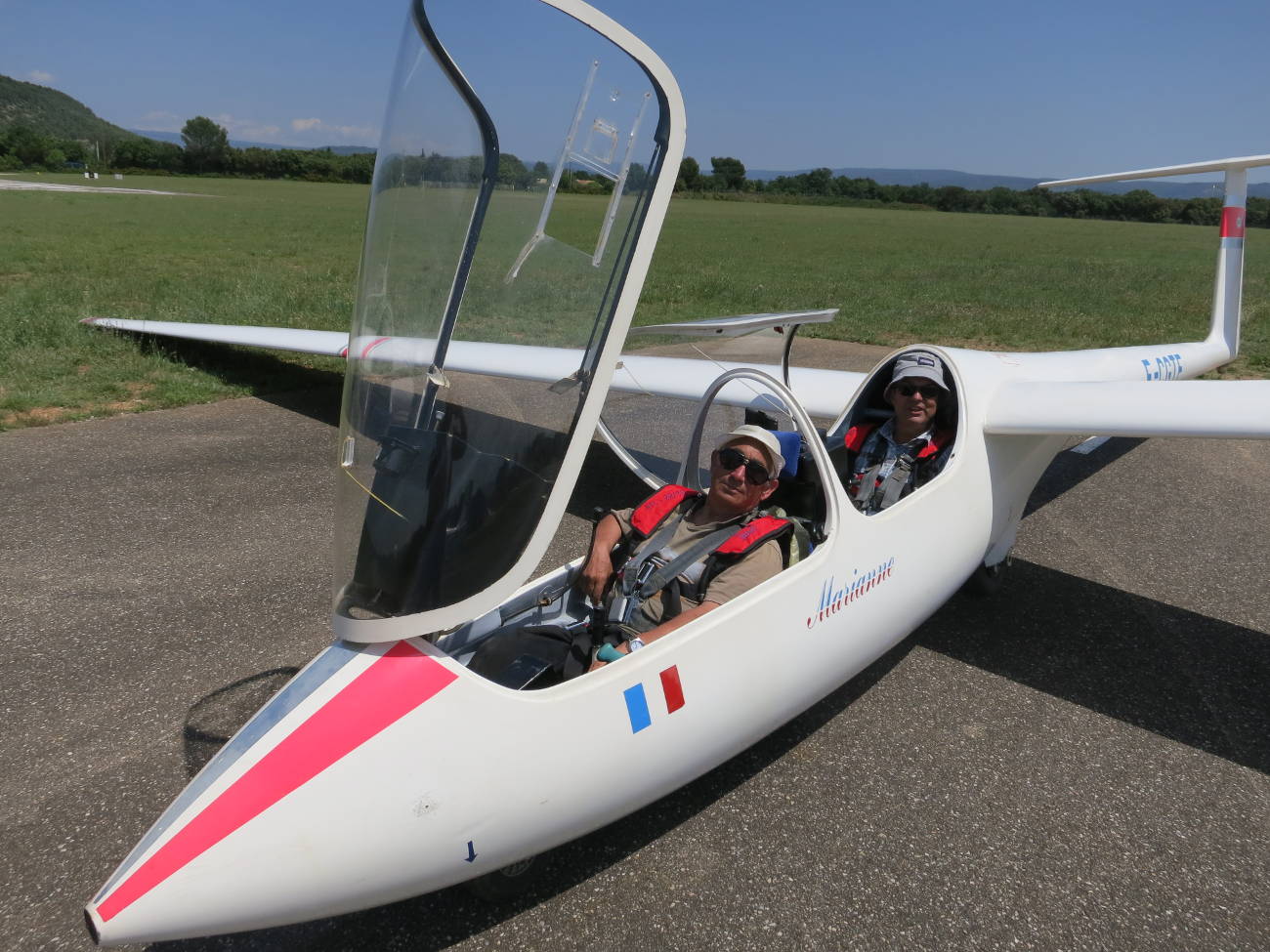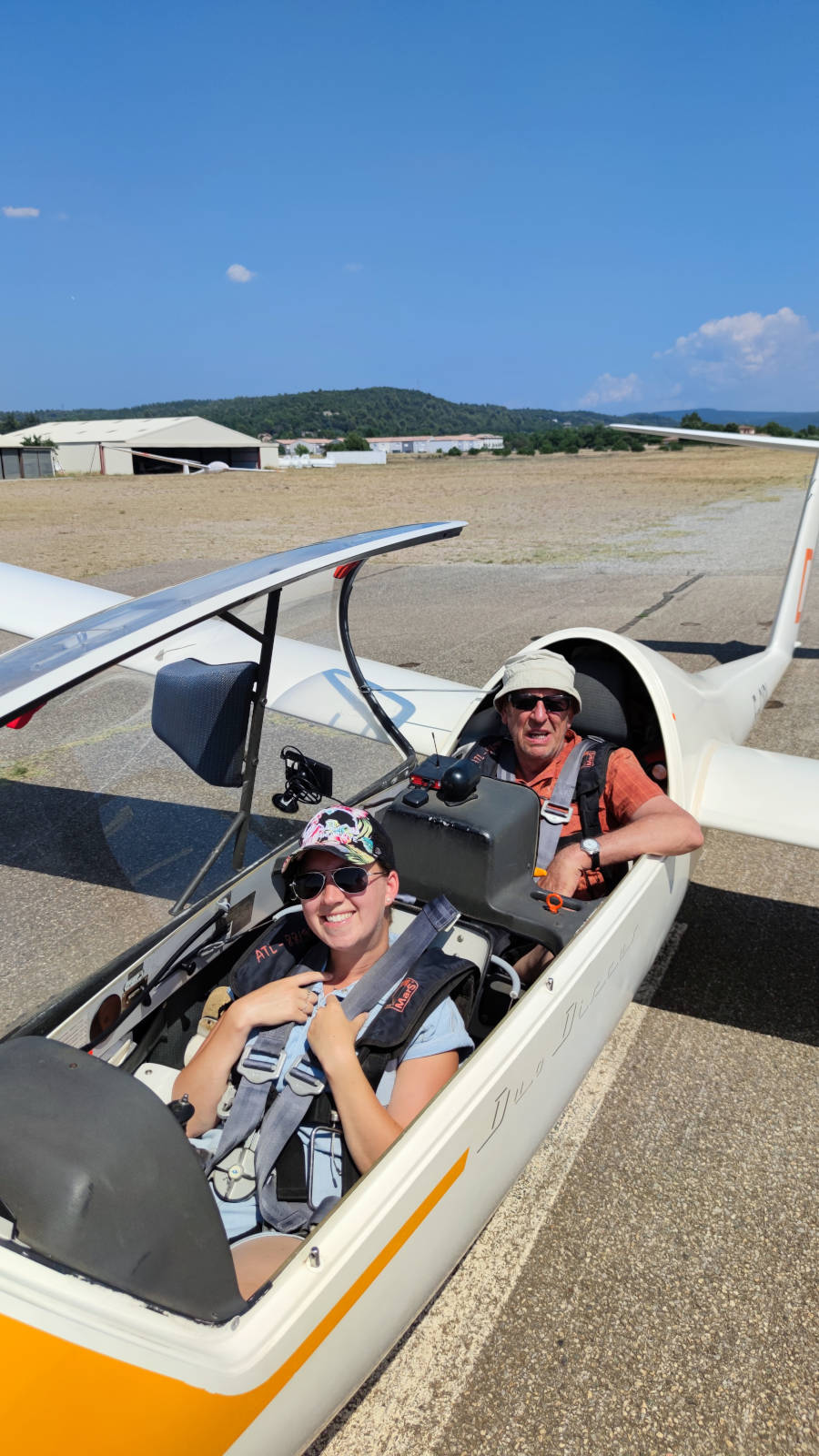 Une chaude journée ce 22 juillet. Marion et Benjamin sont venus à Vinon pour leur 1er vol en planeur. Une belle expérience pour chacun d'eux ; ils ont volé pendant une heure au dessus des basses gorges du Verdon et sur le Luberon. Marion a même expérimenté les prémices du pilotage en prenant les commandes de Manosque à l'étang de la Bonde.