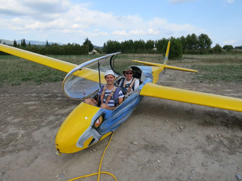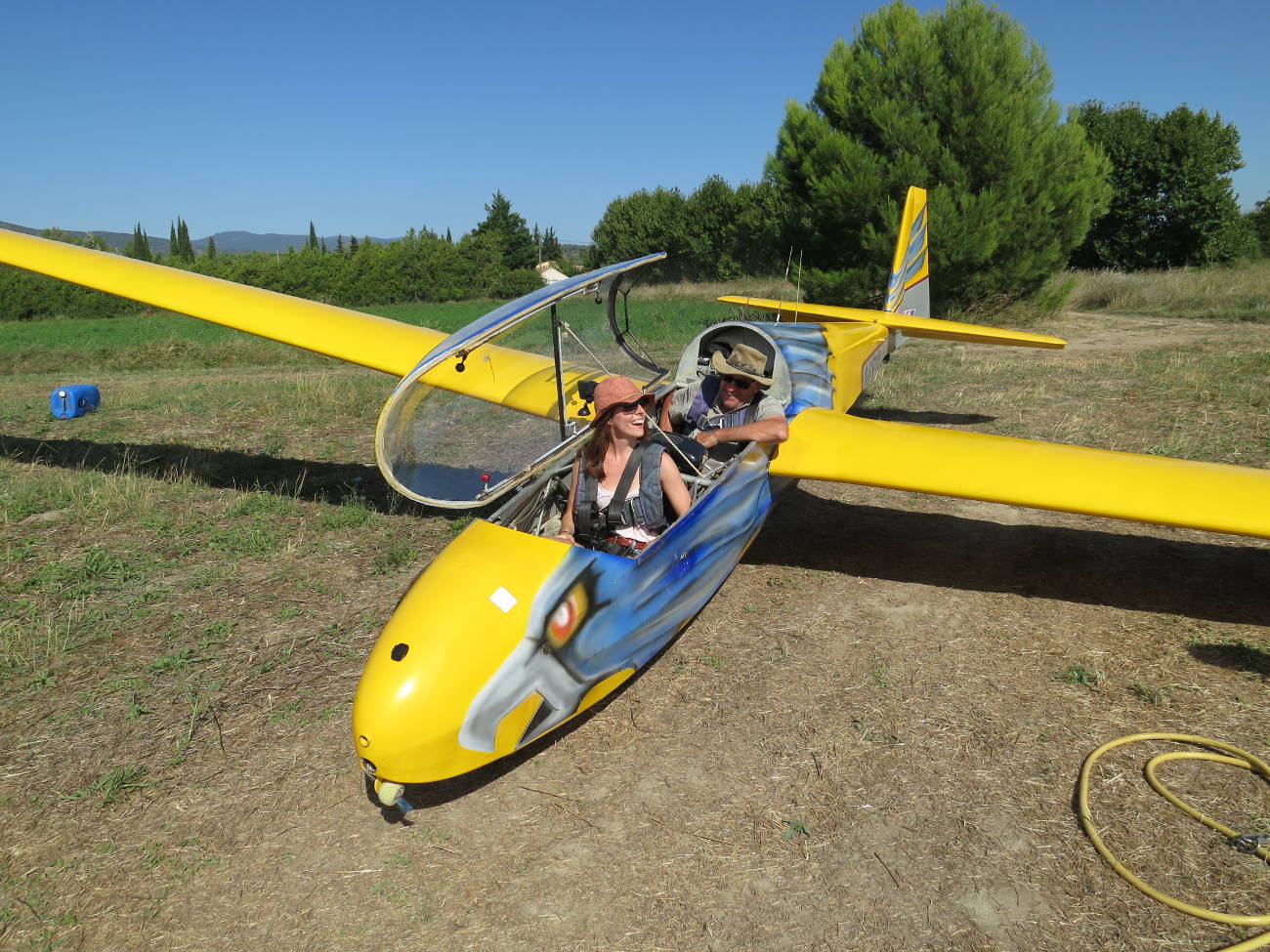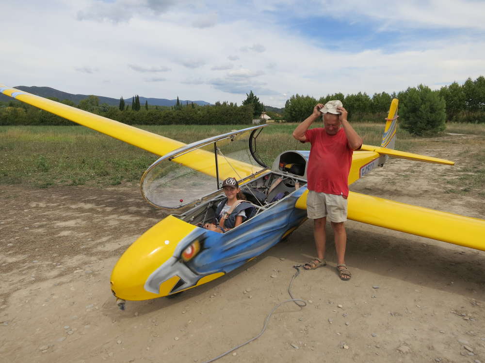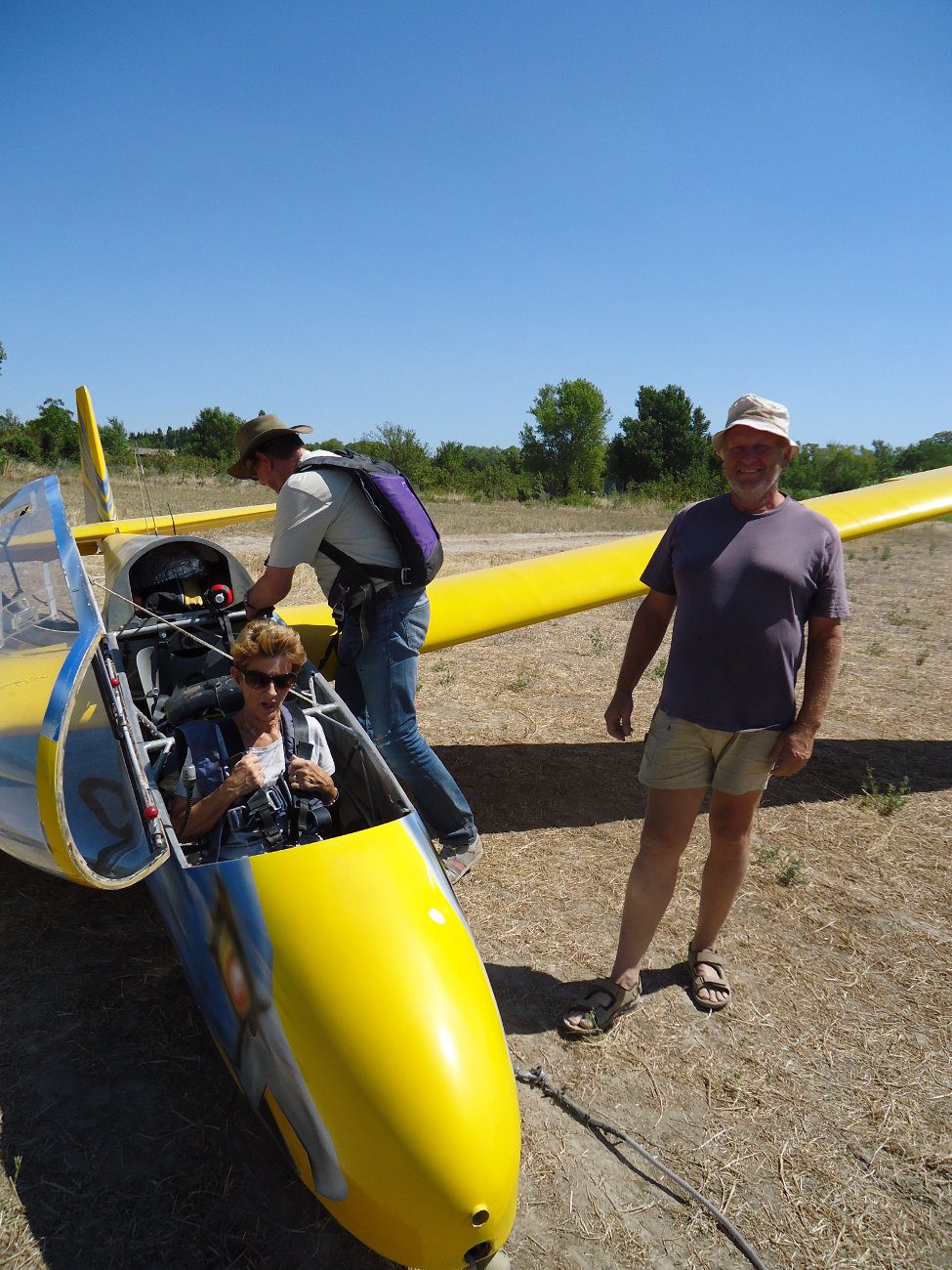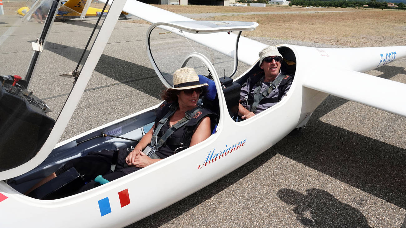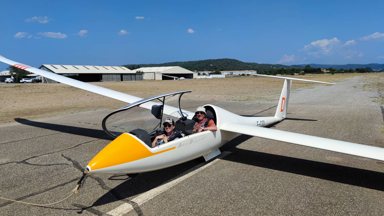 Une chaude journée ce 22 juillet. Marion et Benjamin sont venus à Vinon pour leur 1er vol en planeur. Une belle expérience pour chacun d'eux ; ils ont volé pendant une heure au dessus des basses gorges du Verdon et sur le Luberon. Marion a même expérimenté les prémices du pilotage en prenant les commandes de Manosque à l'étang de la Bonde.