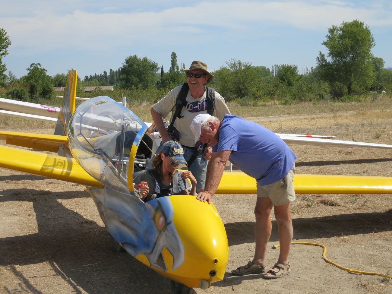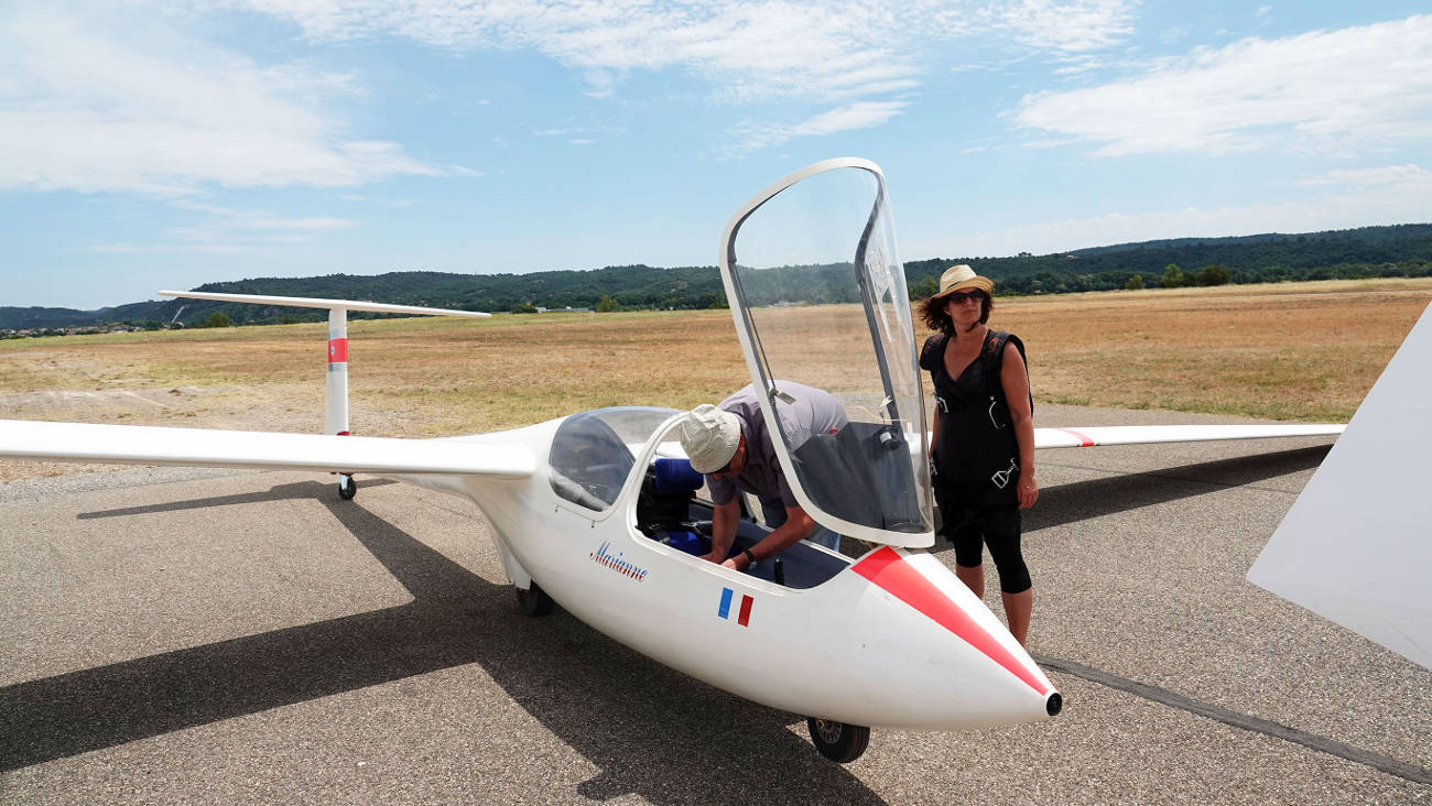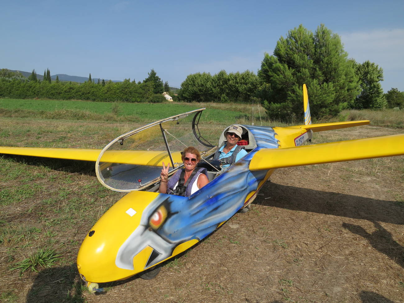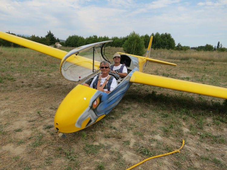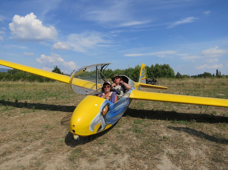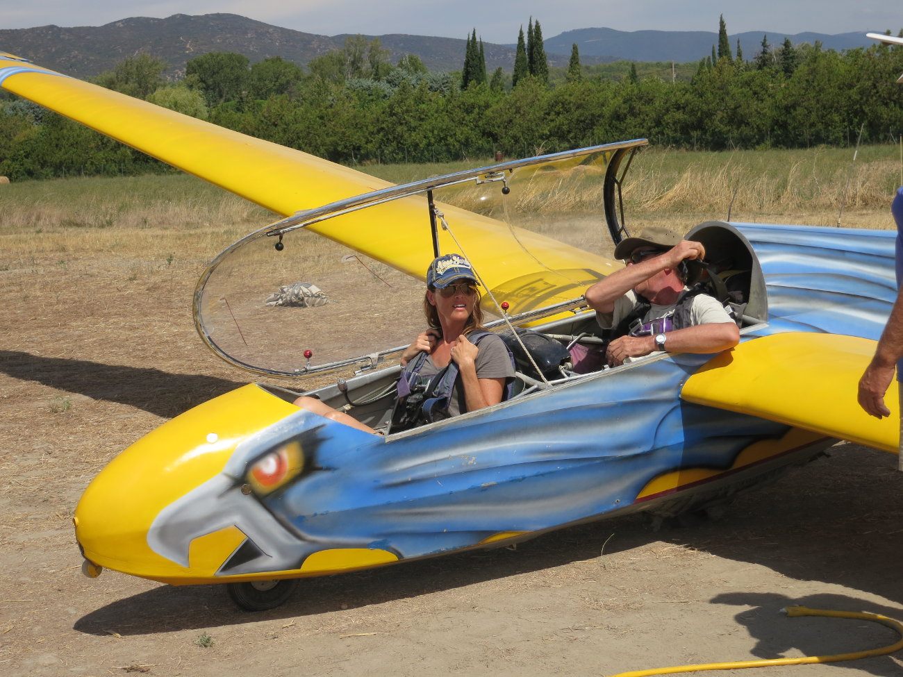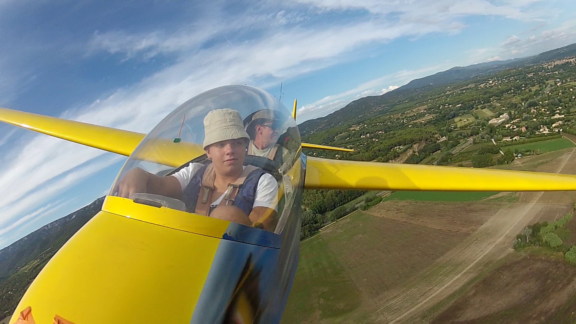Une chaude journée ce 22 juillet. Marion et Benjamin sont venus à Vinon pour leur 1er vol en planeur. Une belle expérience pour chacun d'eux ; ils ont volé pendant une heure au dessus des basses gorges du Verdon et sur le Luberon. Marion a même expérimenté les prémices du pilotage en prenant les commandes de Manosque à l'étang de la Bonde.