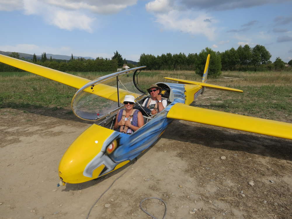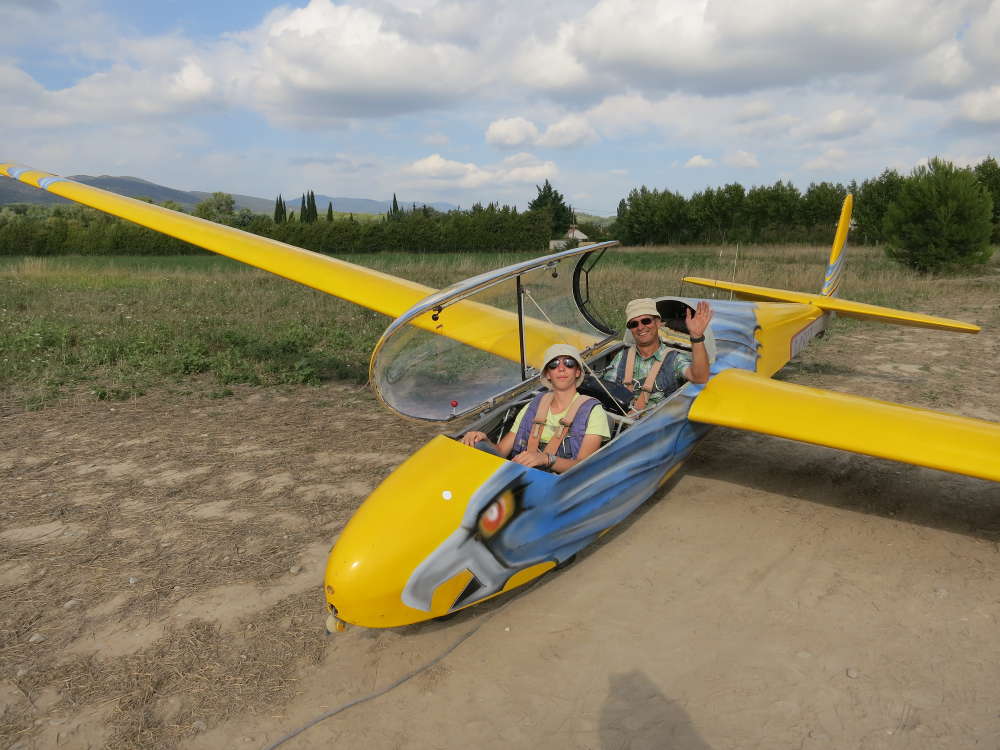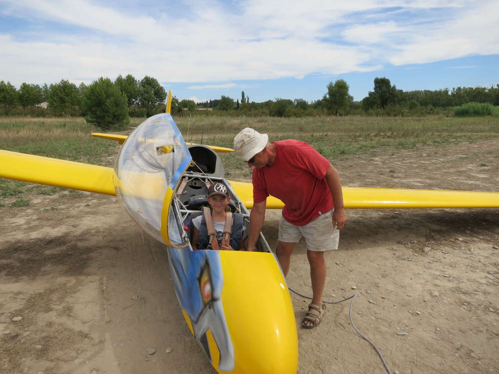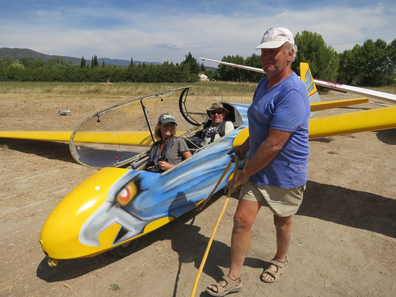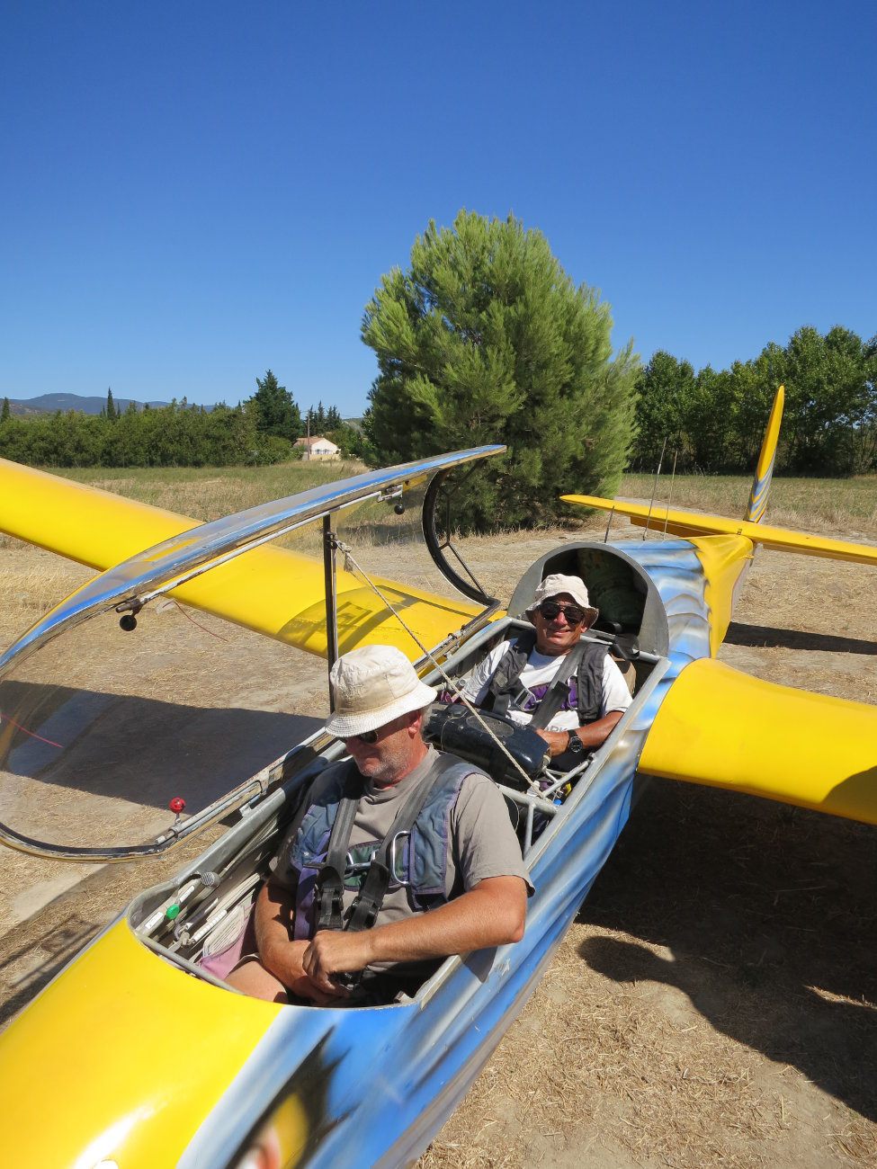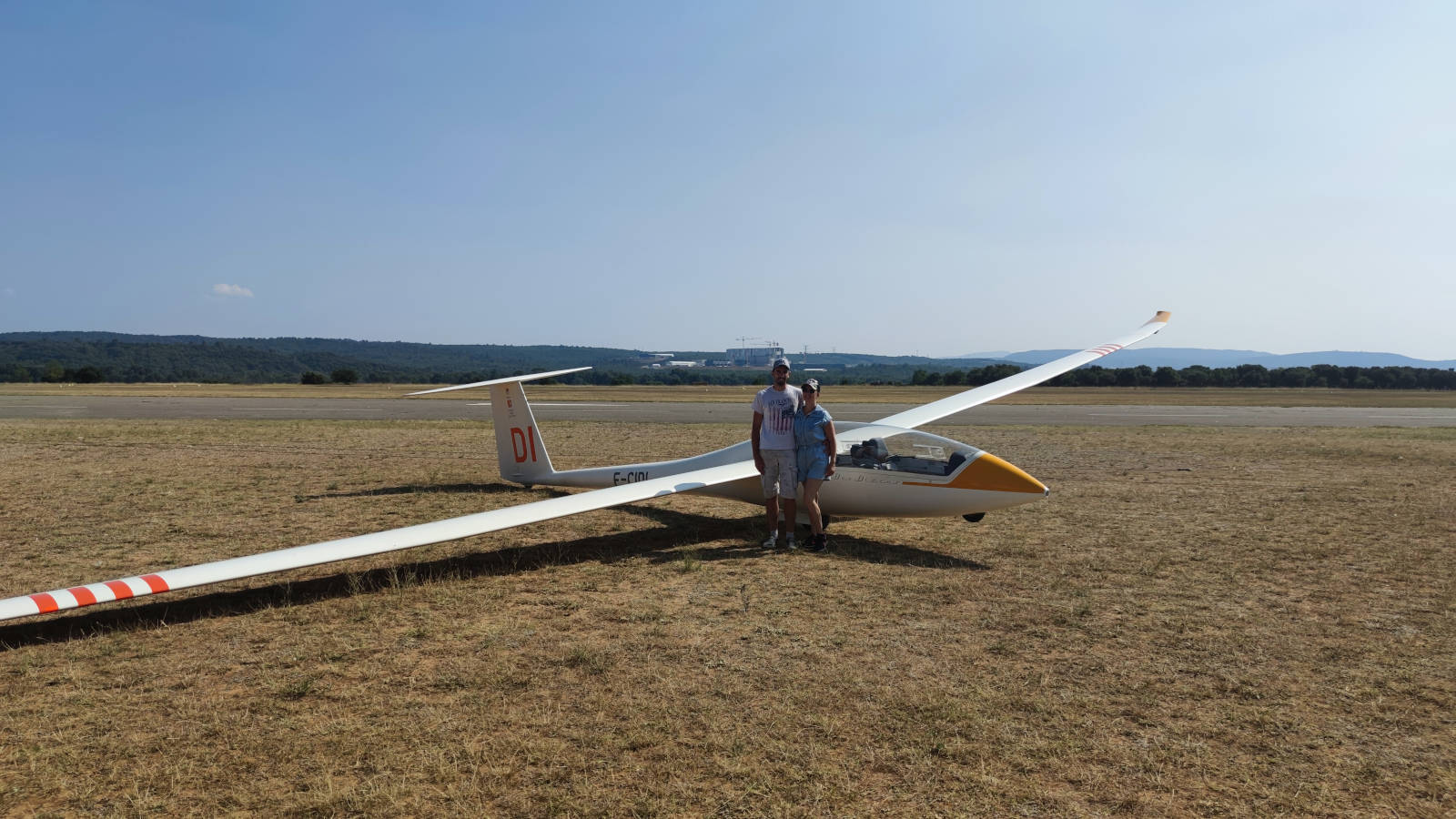 Une chaude journée ce 22 juillet. Marion et Benjamin sont venus à Vinon pour leur 1er vol en planeur. Une belle expérience pour chacun d'eux ; ils ont volé pendant une heure au dessus des basses gorges du Verdon et sur le Luberon. Marion a même expérimenté les prémices du pilotage en prenant les commandes de Manosque à l'étang de la Bonde.