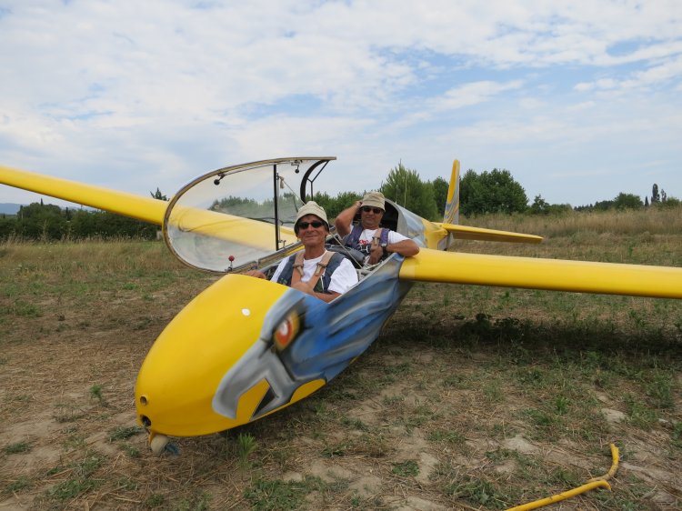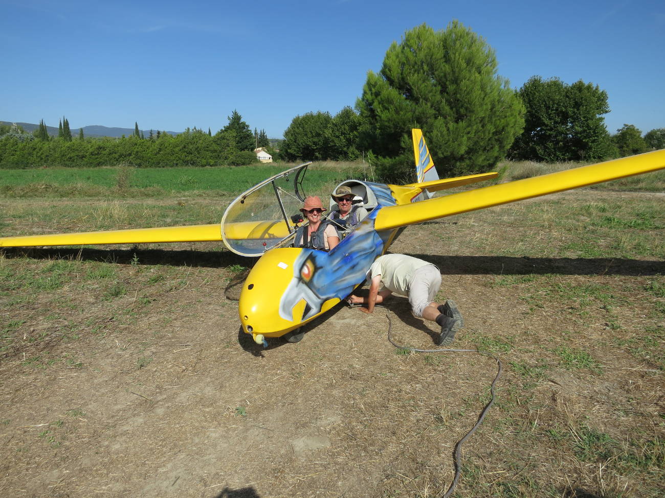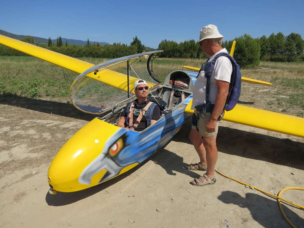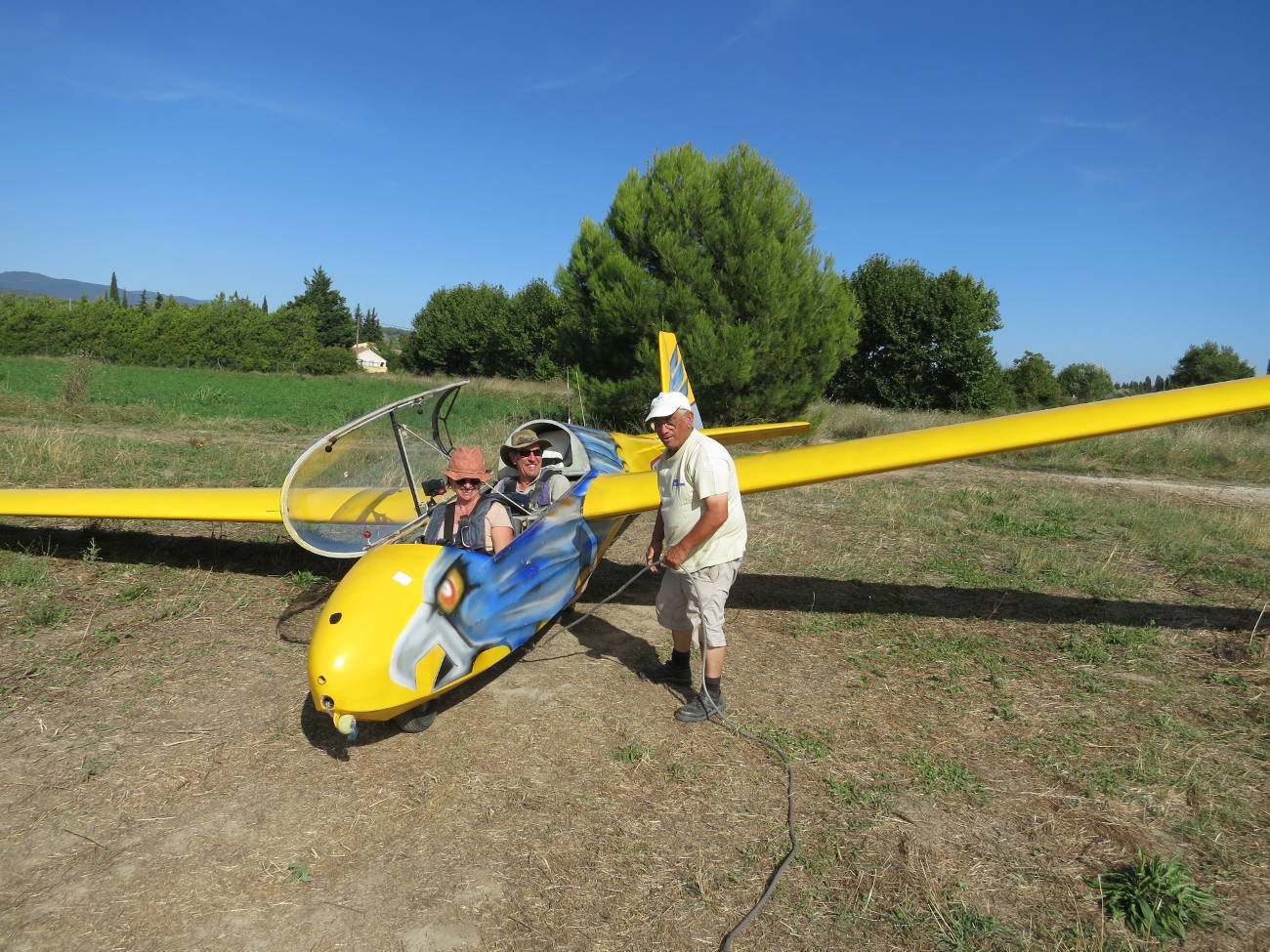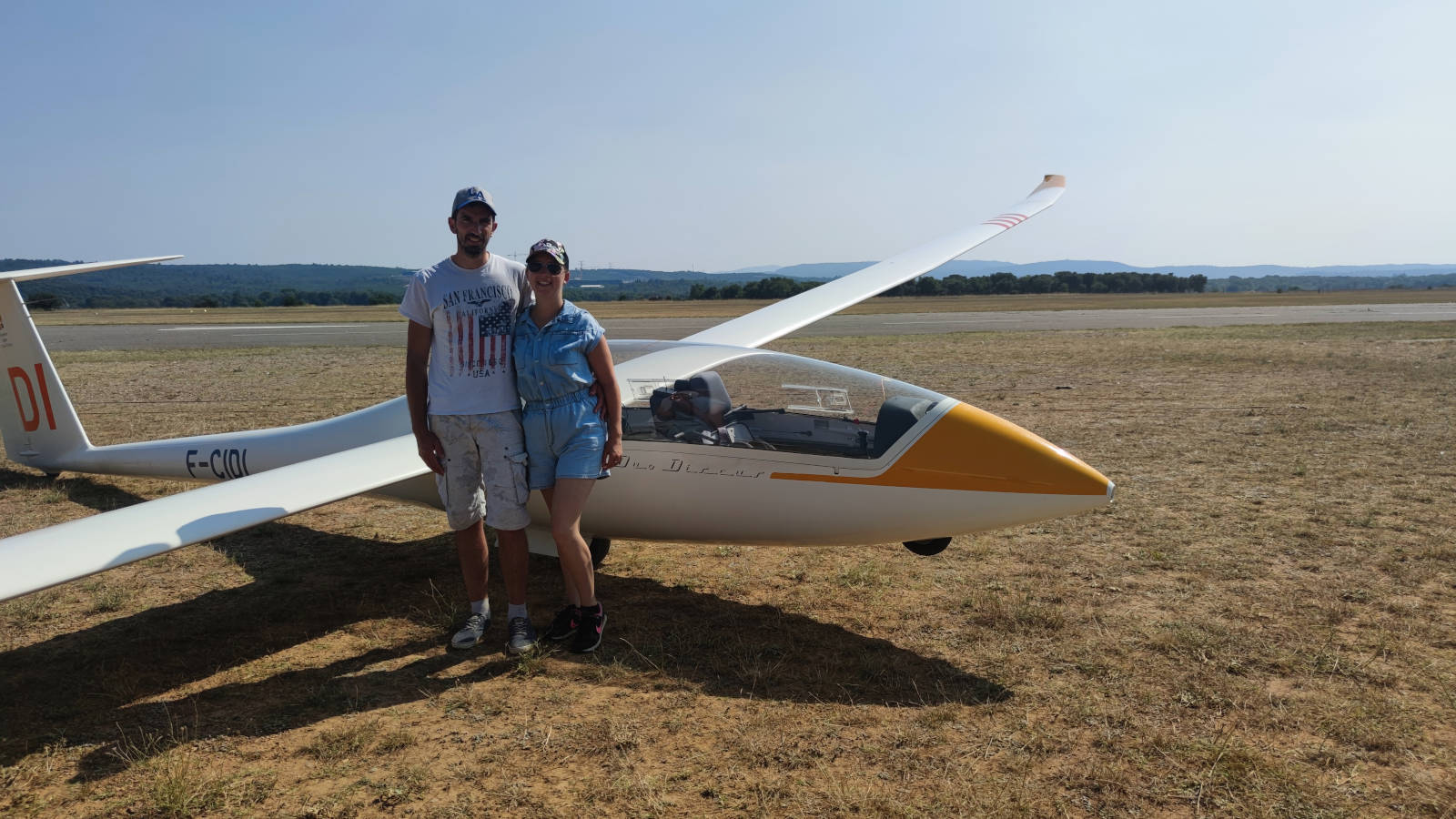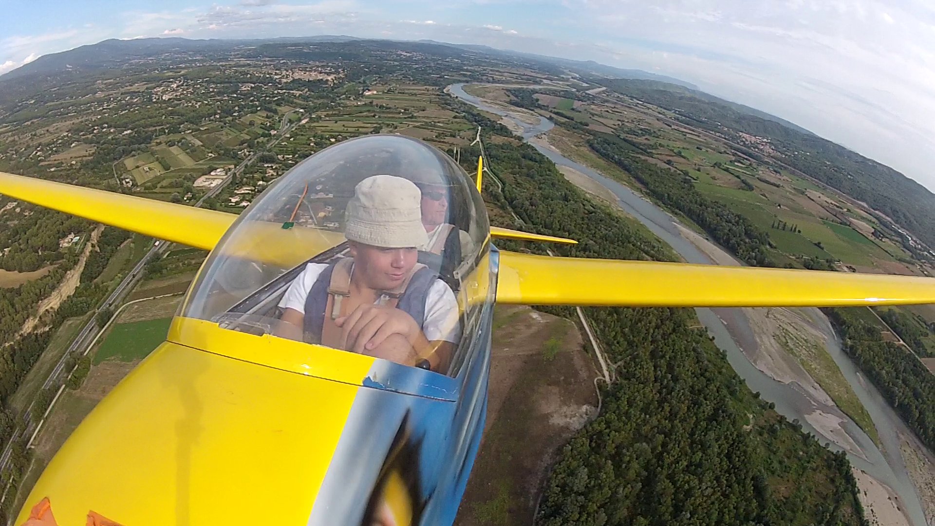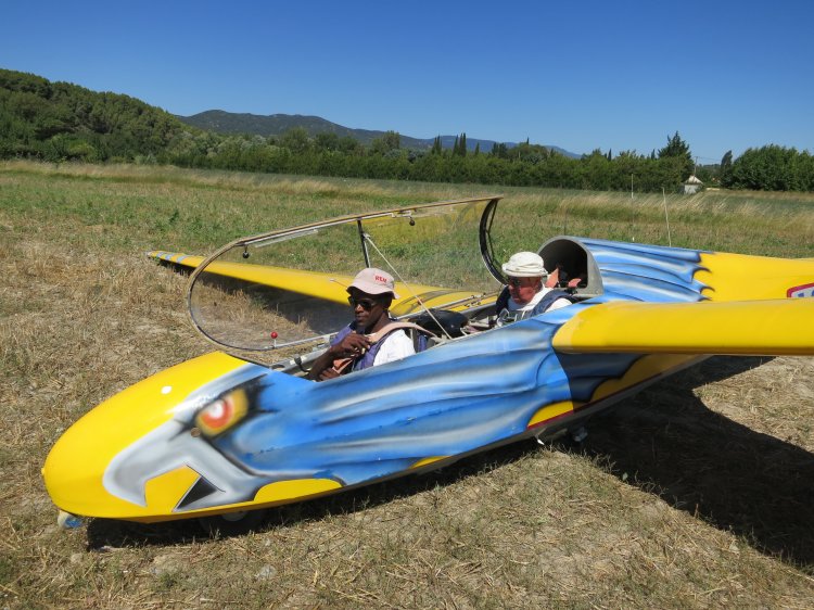 Une chaude journée ce 22 juillet. Marion et Benjamin sont venus à Vinon pour leur 1er vol en planeur. Une belle expérience pour chacun d'eux ; ils ont volé pendant une heure au dessus des basses gorges du Verdon et sur le Luberon. Marion a même expérimenté les prémices du pilotage en prenant les commandes de Manosque à l'étang de la Bonde.