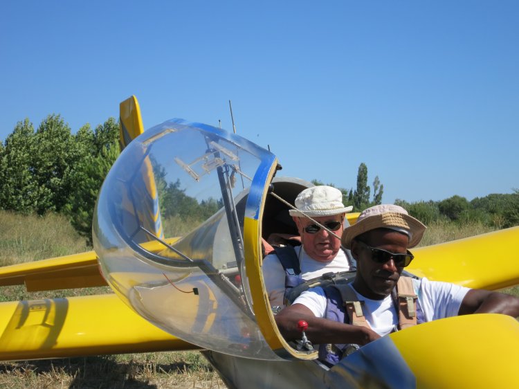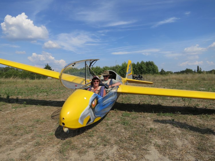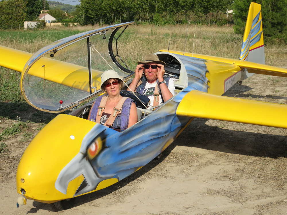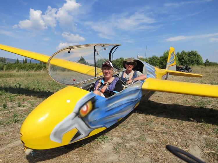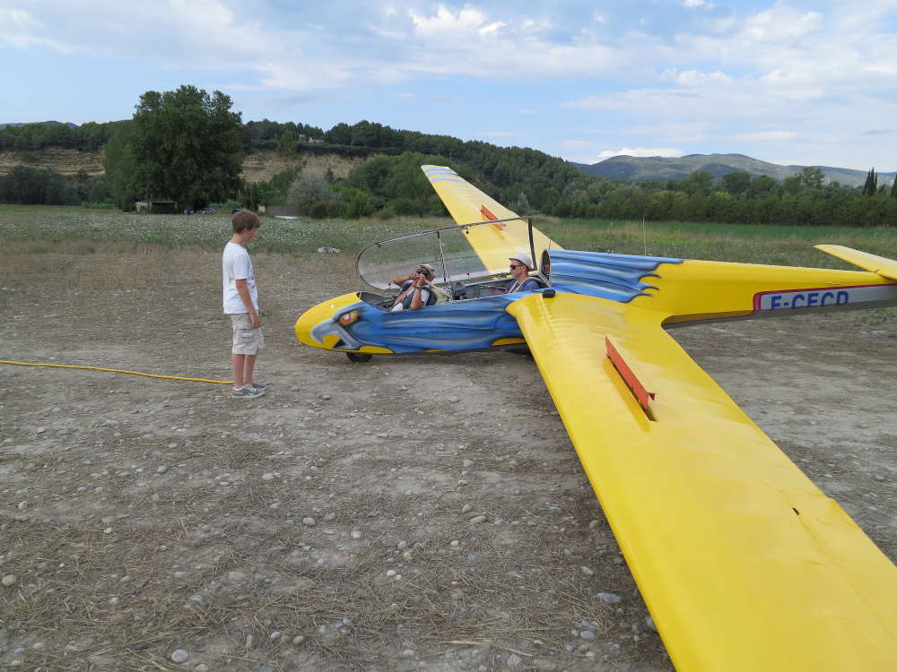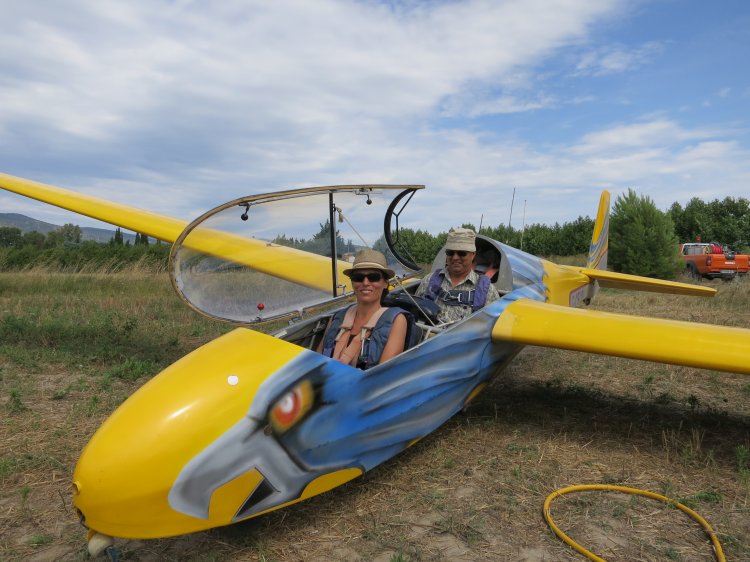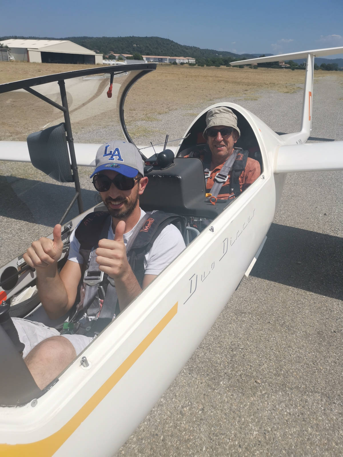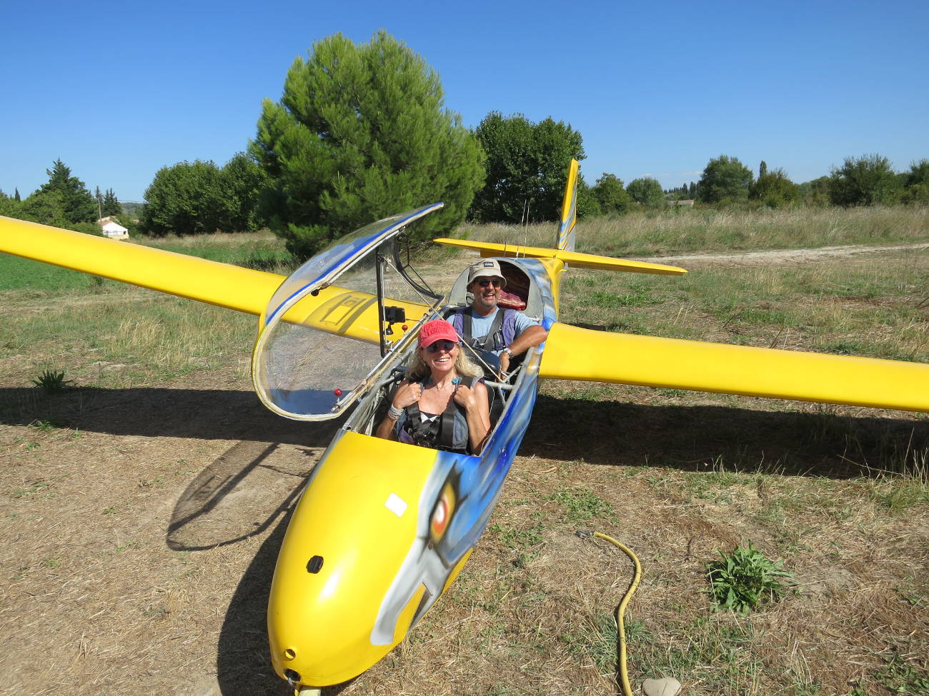 Une chaude journée ce 22 juillet. Marion et Benjamin sont venus à Vinon pour leur 1er vol en planeur. Une belle expérience pour chacun d'eux ; ils ont volé pendant une heure au dessus des basses gorges du Verdon et sur le Luberon. Marion a même expérimenté les prémices du pilotage en prenant les commandes de Manosque à l'étang de la Bonde.