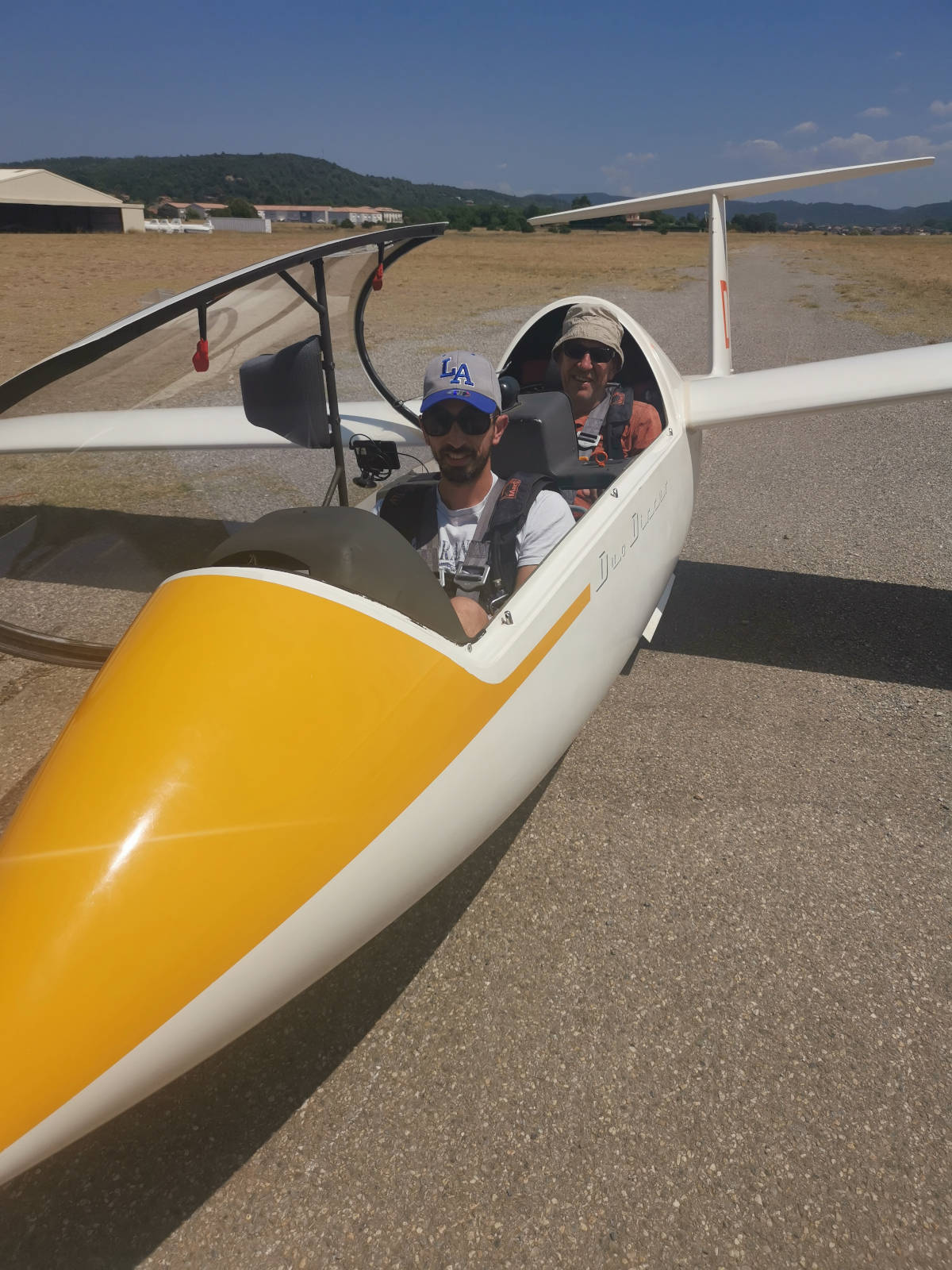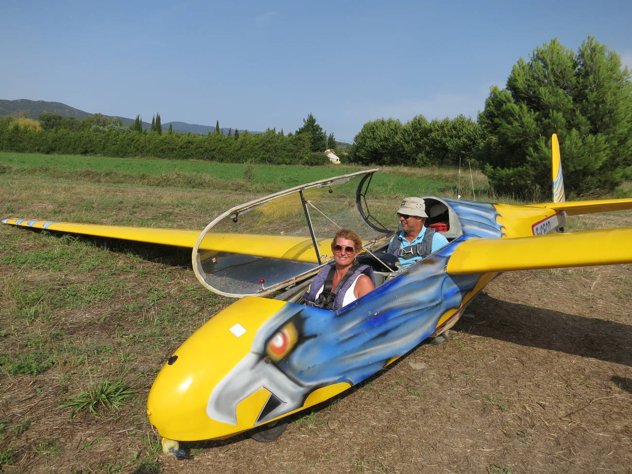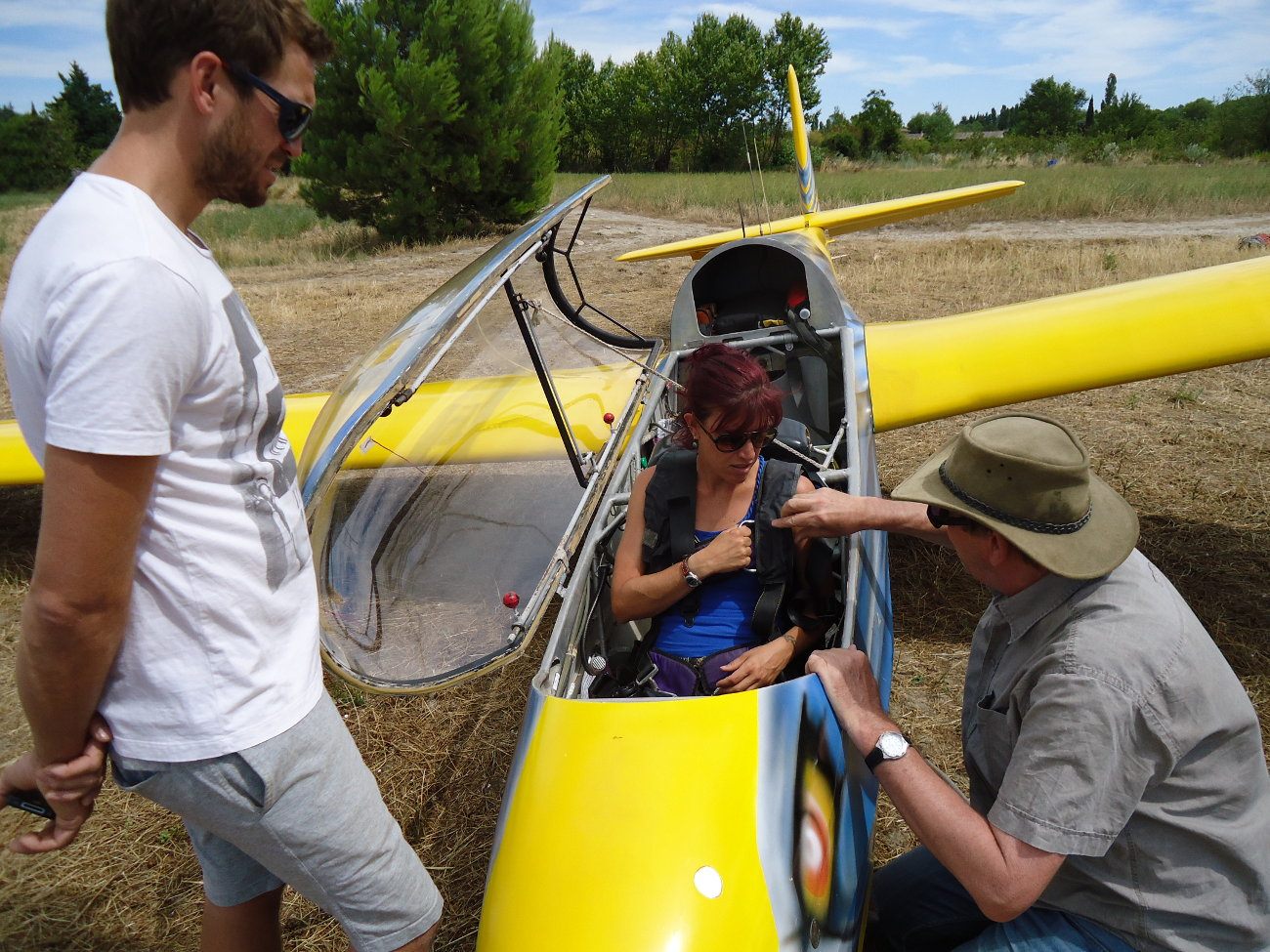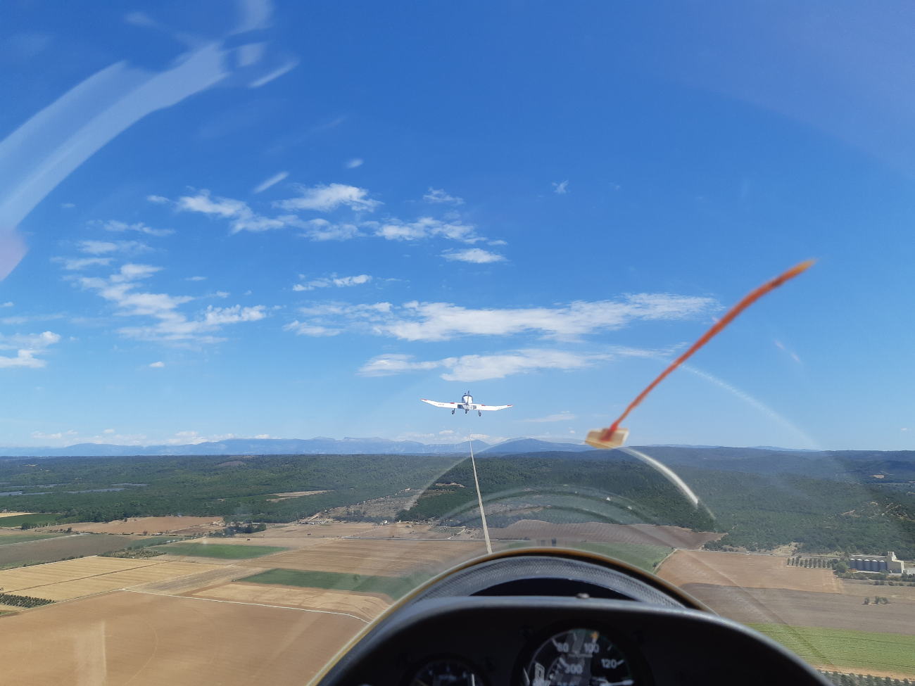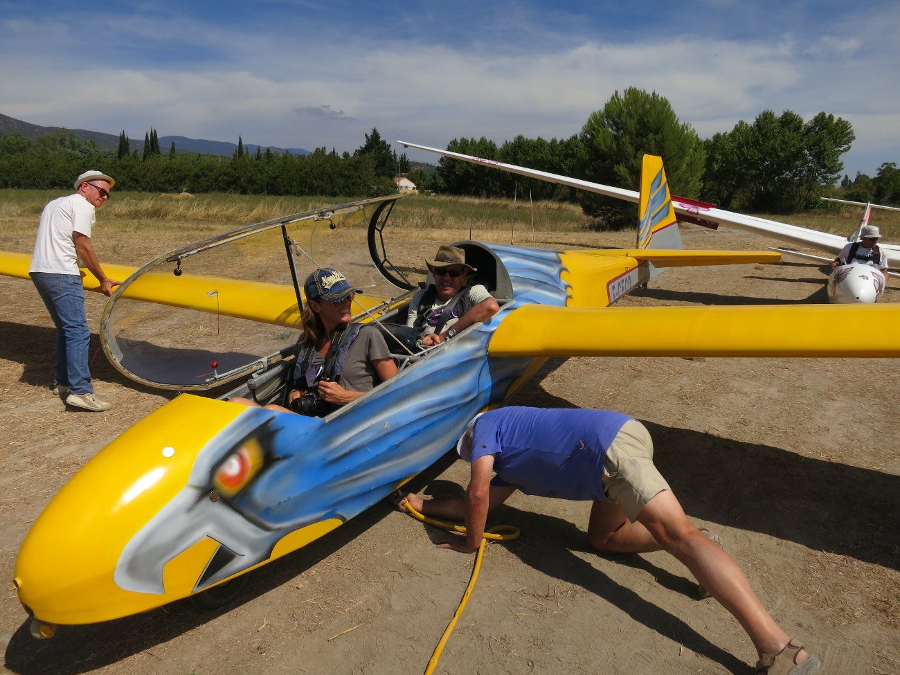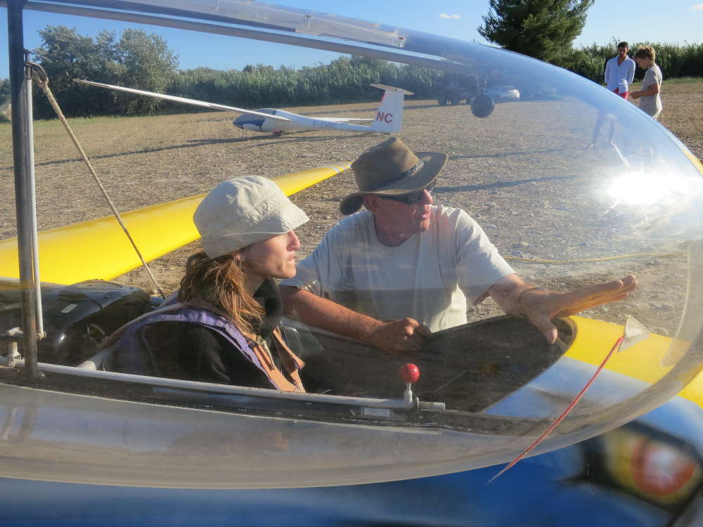 Une chaude journée ce 22 juillet. Marion et Benjamin sont venus à Vinon pour leur 1er vol en planeur. Une belle expérience pour chacun d'eux ; ils ont volé pendant une heure au dessus des basses gorges du Verdon et sur le Luberon. Marion a même expérimenté les prémices du pilotage en prenant les commandes de Manosque à l'étang de la Bonde.