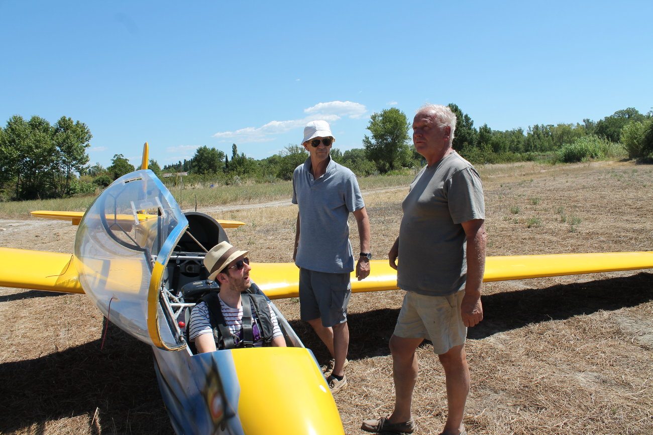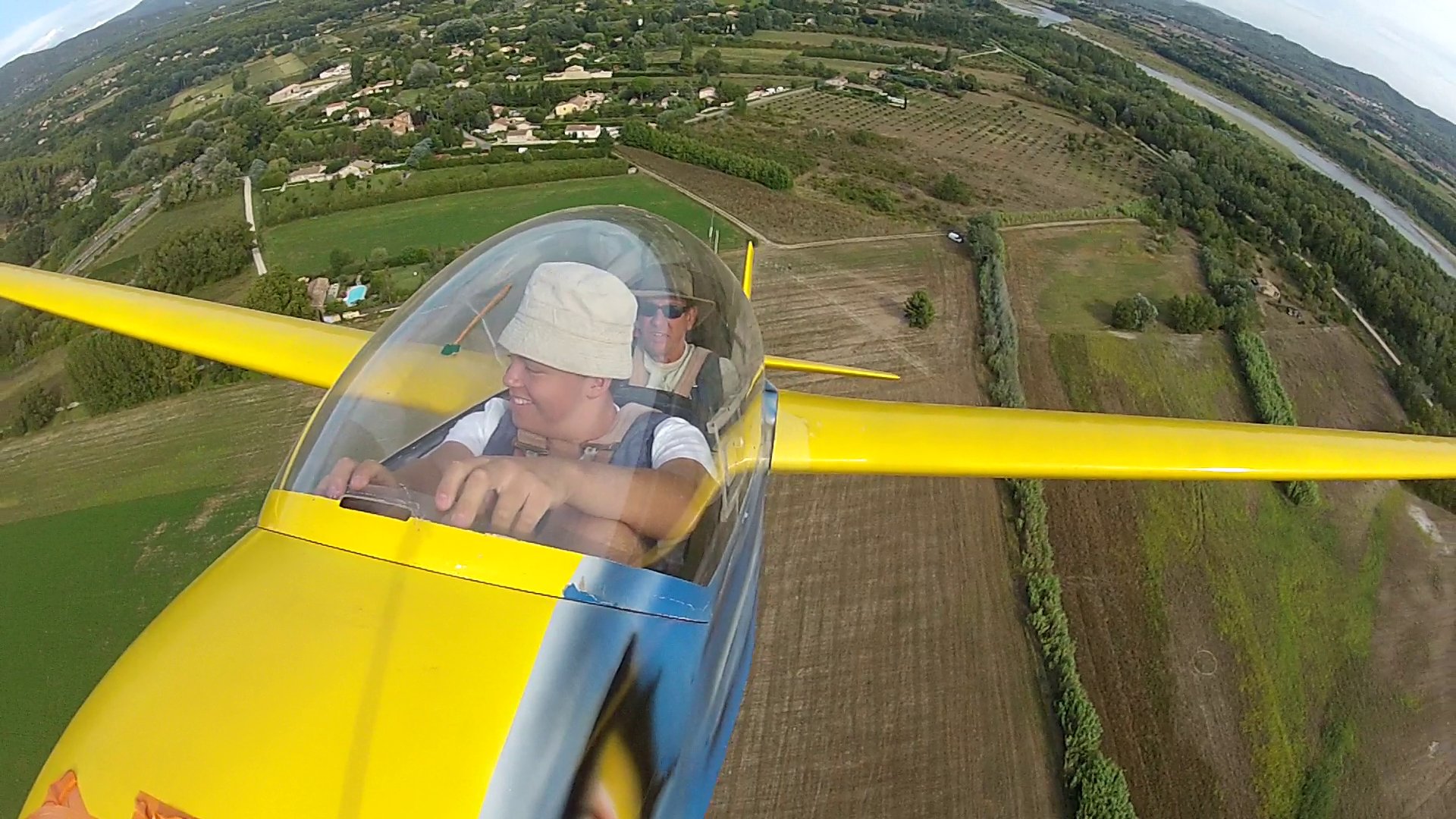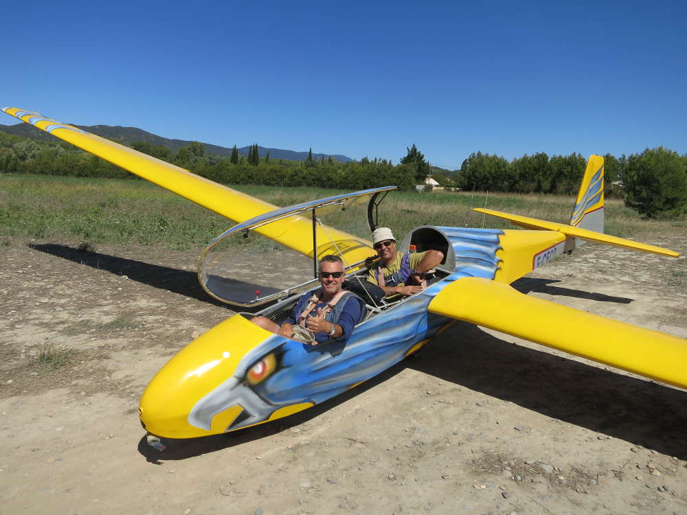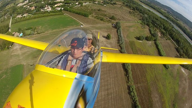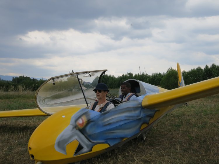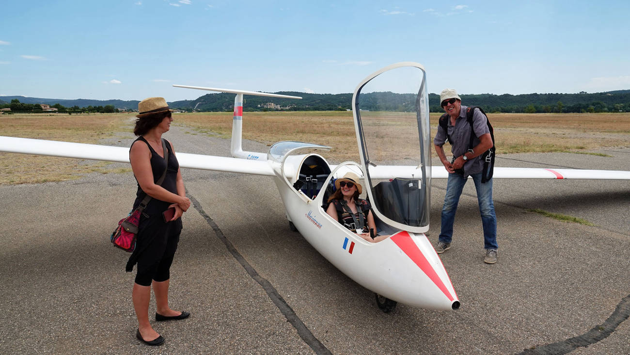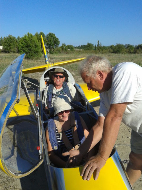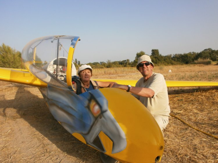 Une chaude journée ce 22 juillet. Marion et Benjamin sont venus à Vinon pour leur 1er vol en planeur. Une belle expérience pour chacun d'eux ; ils ont volé pendant une heure au dessus des basses gorges du Verdon et sur le Luberon. Marion a même expérimenté les prémices du pilotage en prenant les commandes de Manosque à l'étang de la Bonde.