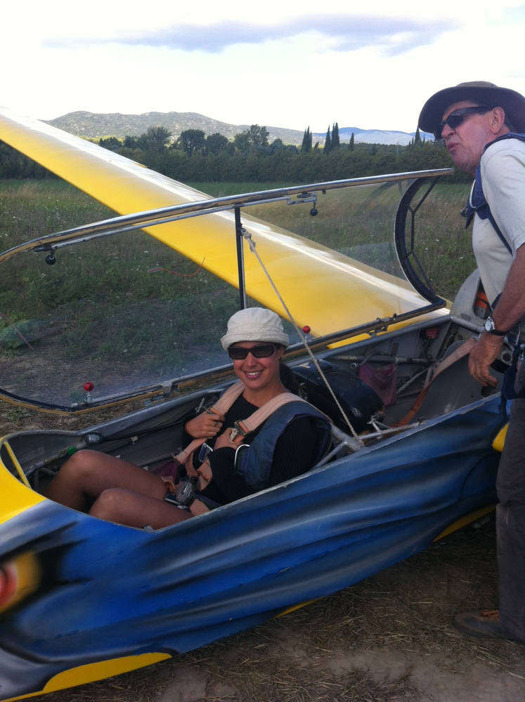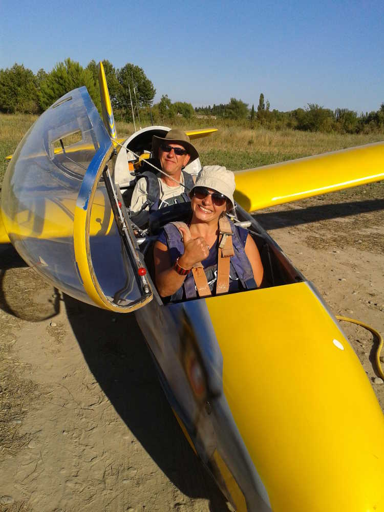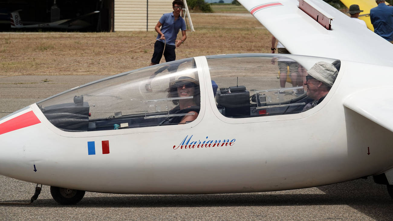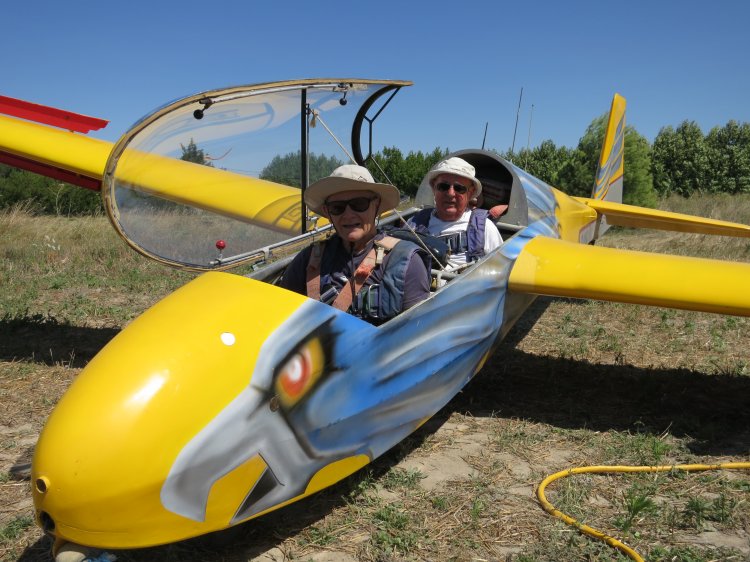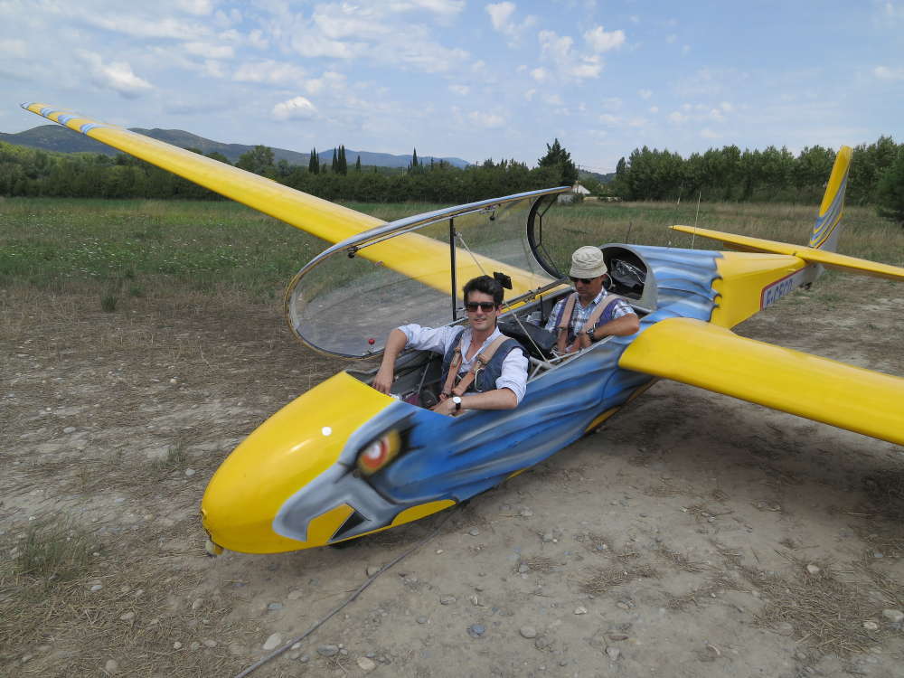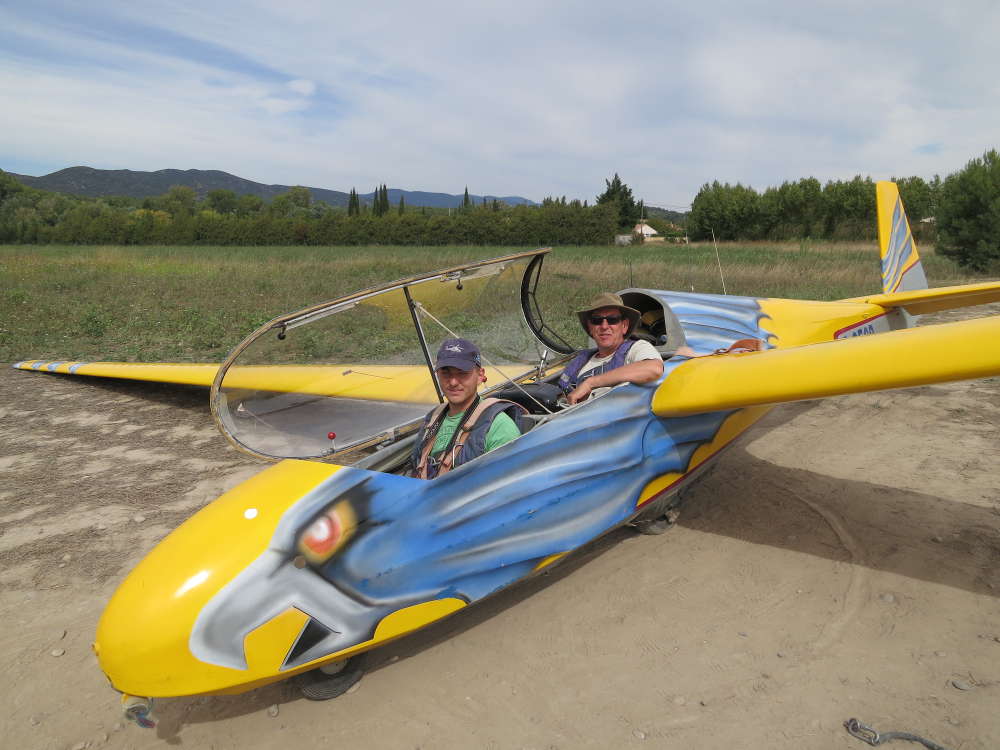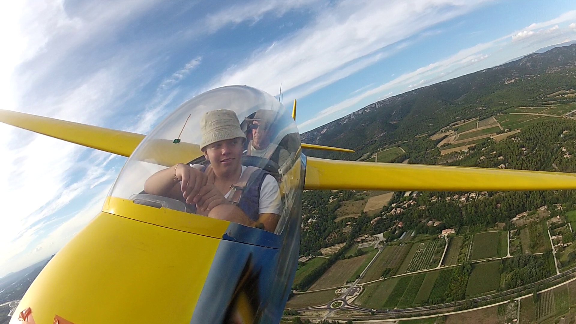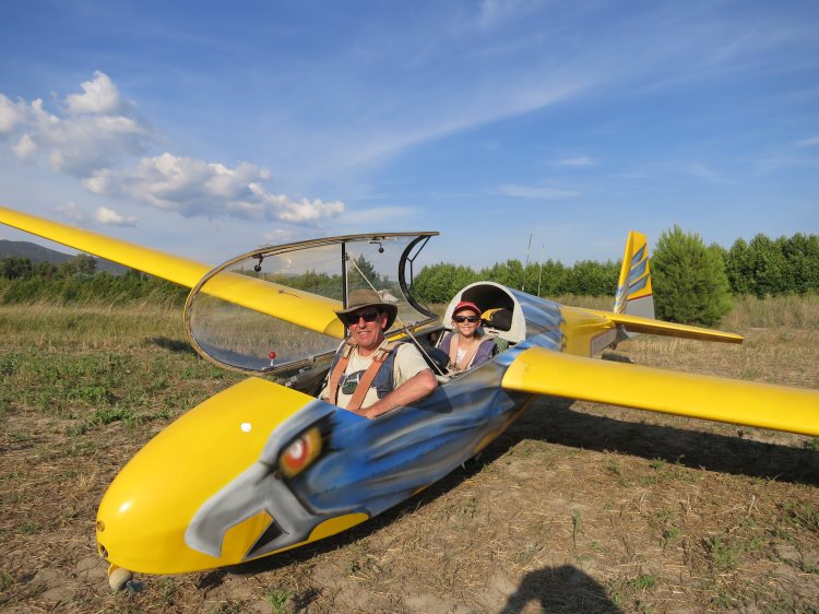 Une chaude journée ce 22 juillet. Marion et Benjamin sont venus à Vinon pour leur 1er vol en planeur. Une belle expérience pour chacun d'eux ; ils ont volé pendant une heure au dessus des basses gorges du Verdon et sur le Luberon. Marion a même expérimenté les prémices du pilotage en prenant les commandes de Manosque à l'étang de la Bonde.