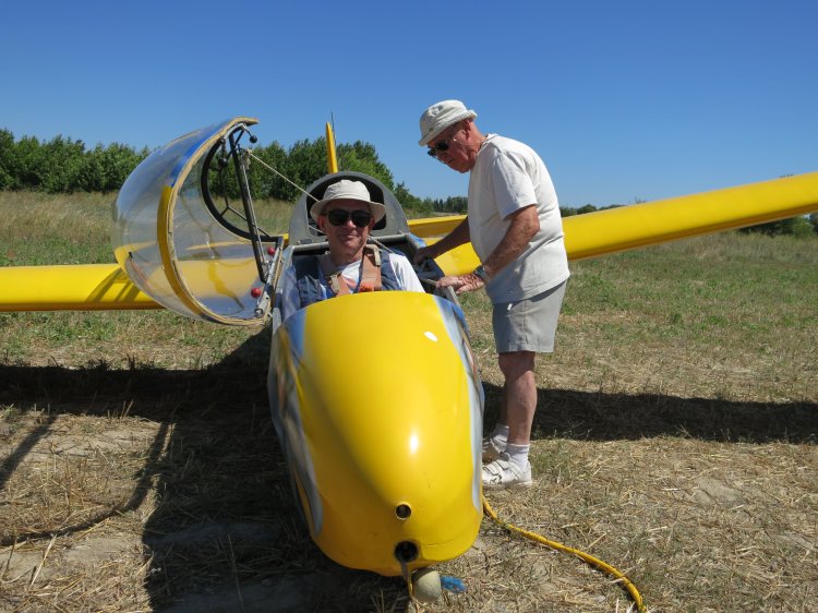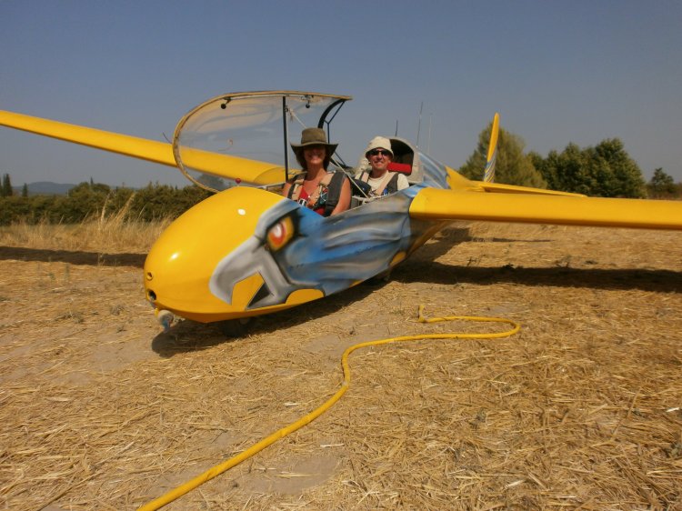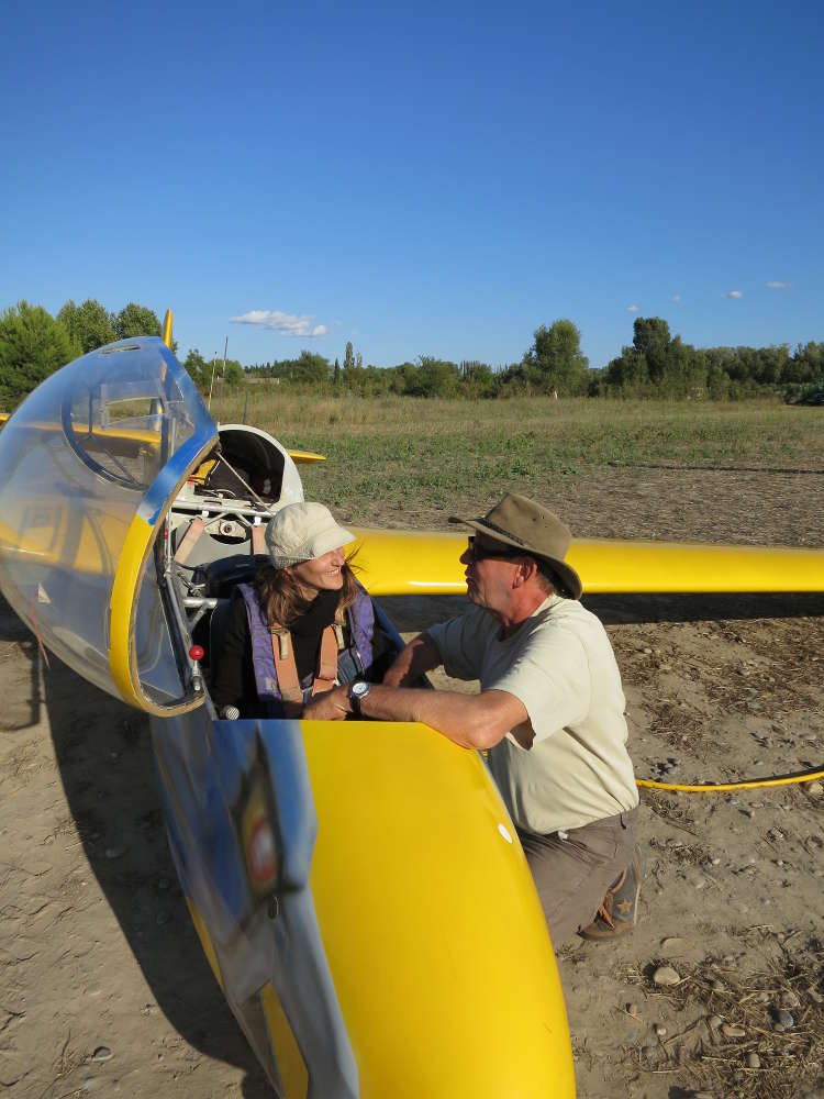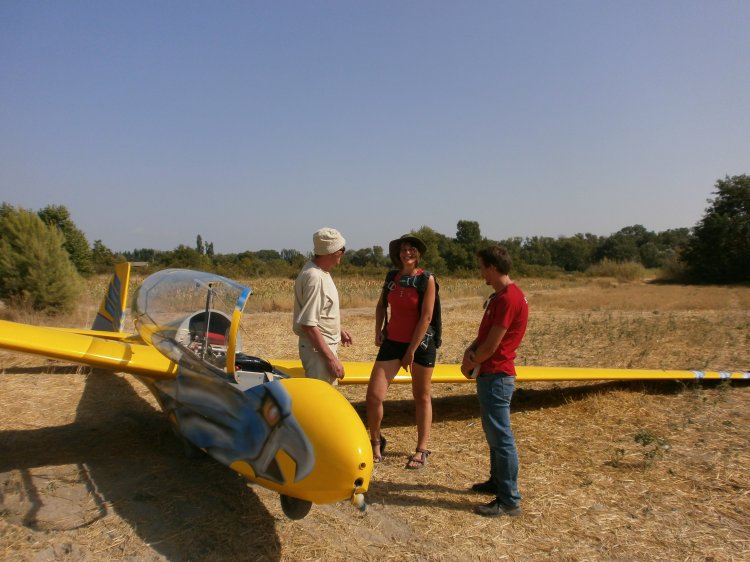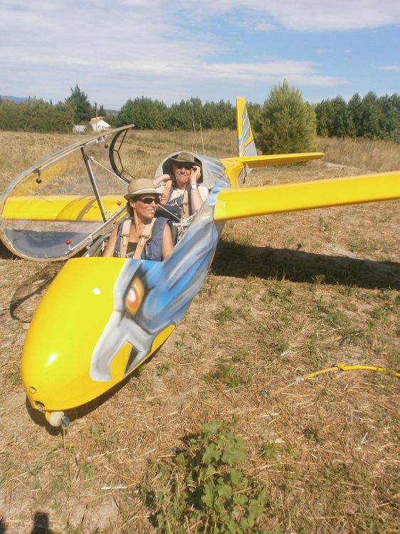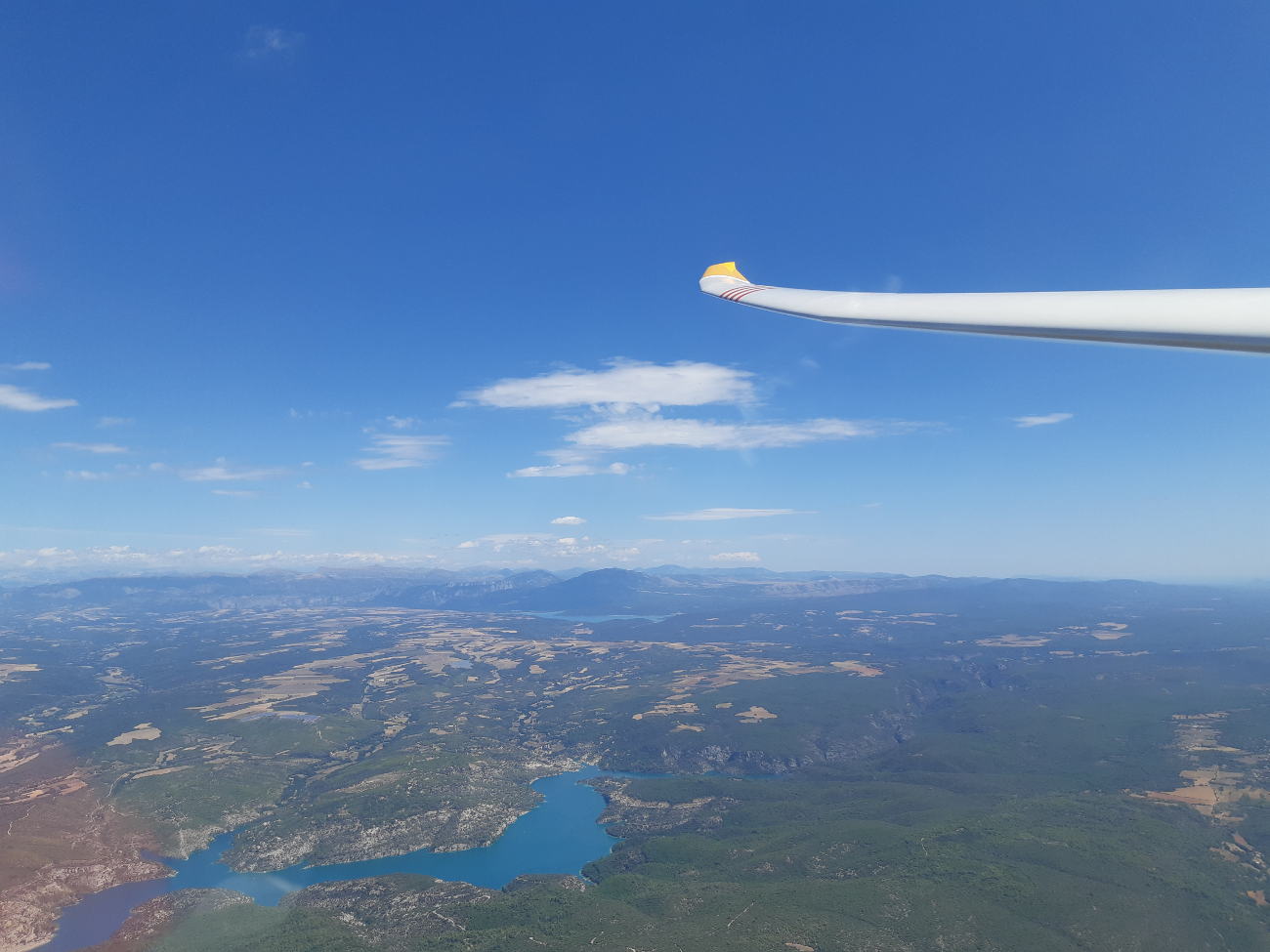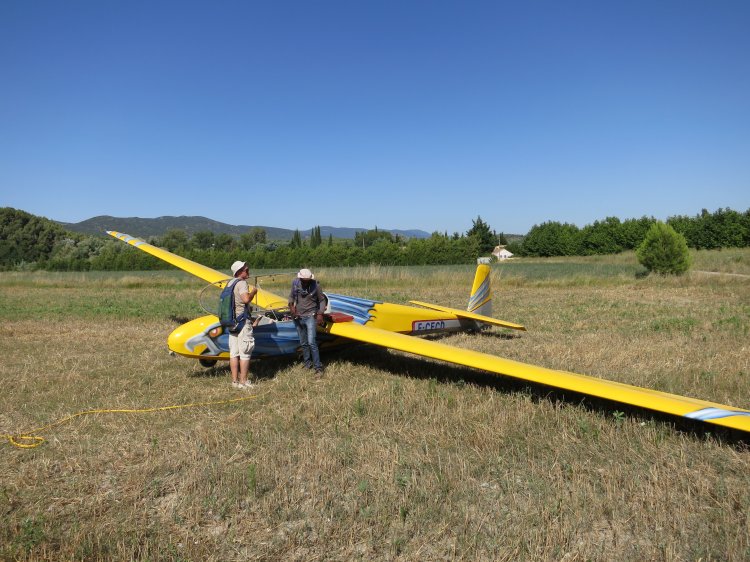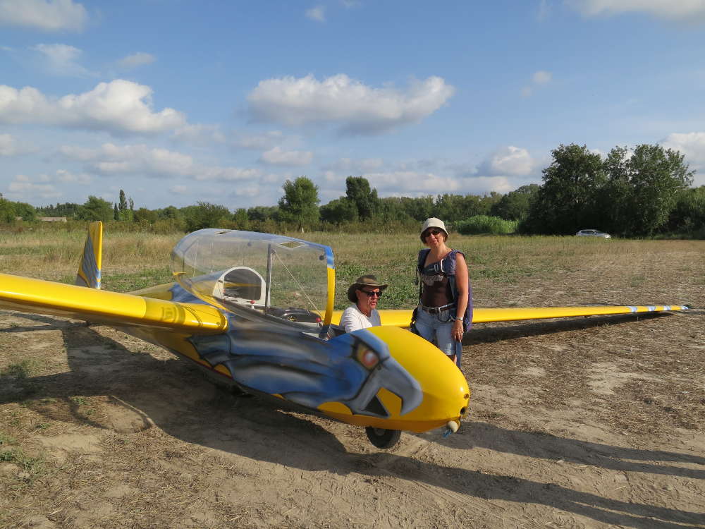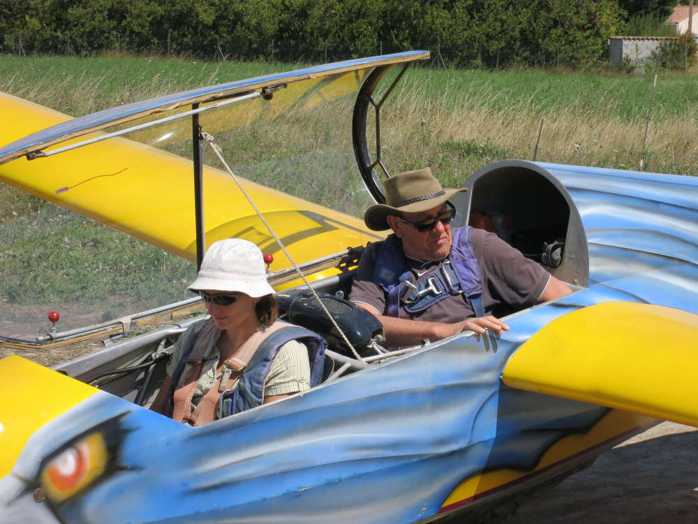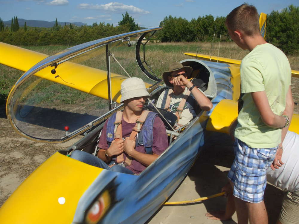 Une chaude journée ce 22 juillet. Marion et Benjamin sont venus à Vinon pour leur 1er vol en planeur. Une belle expérience pour chacun d'eux ; ils ont volé pendant une heure au dessus des basses gorges du Verdon et sur le Luberon. Marion a même expérimenté les prémices du pilotage en prenant les commandes de Manosque à l'étang de la Bonde.