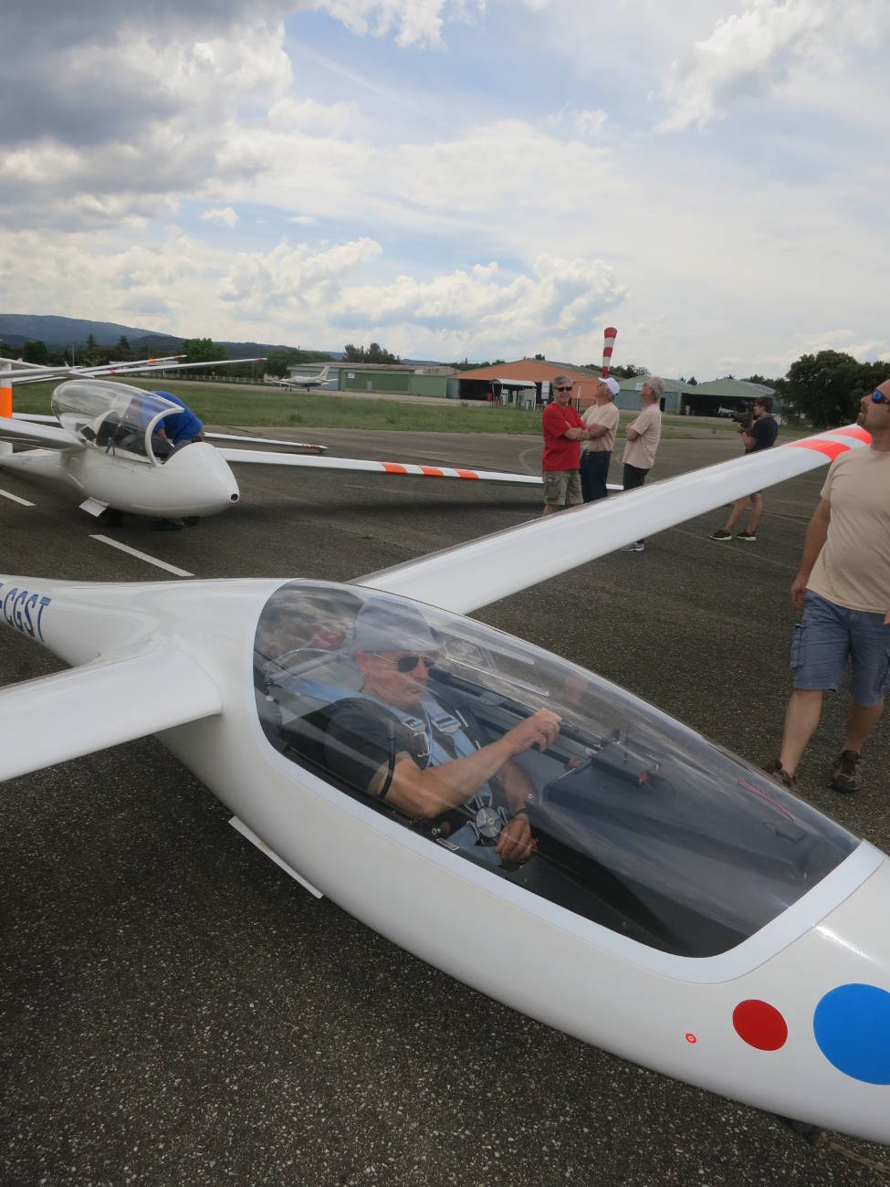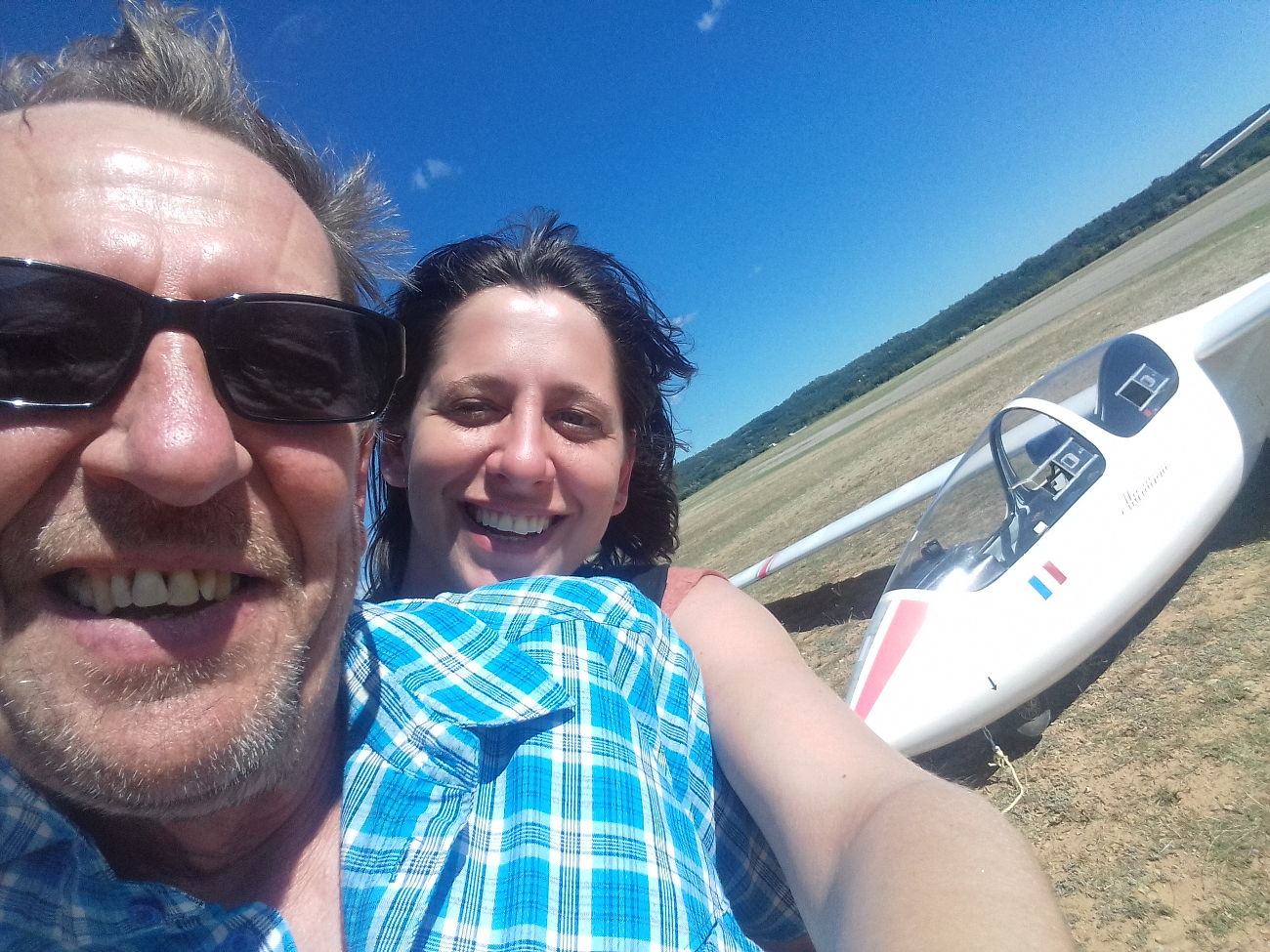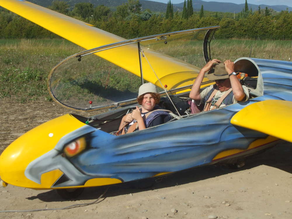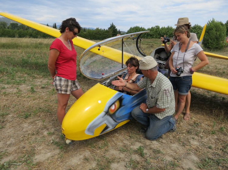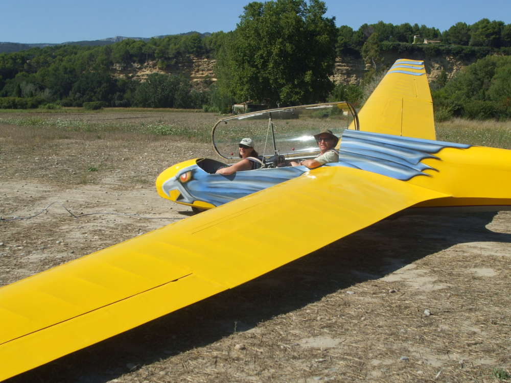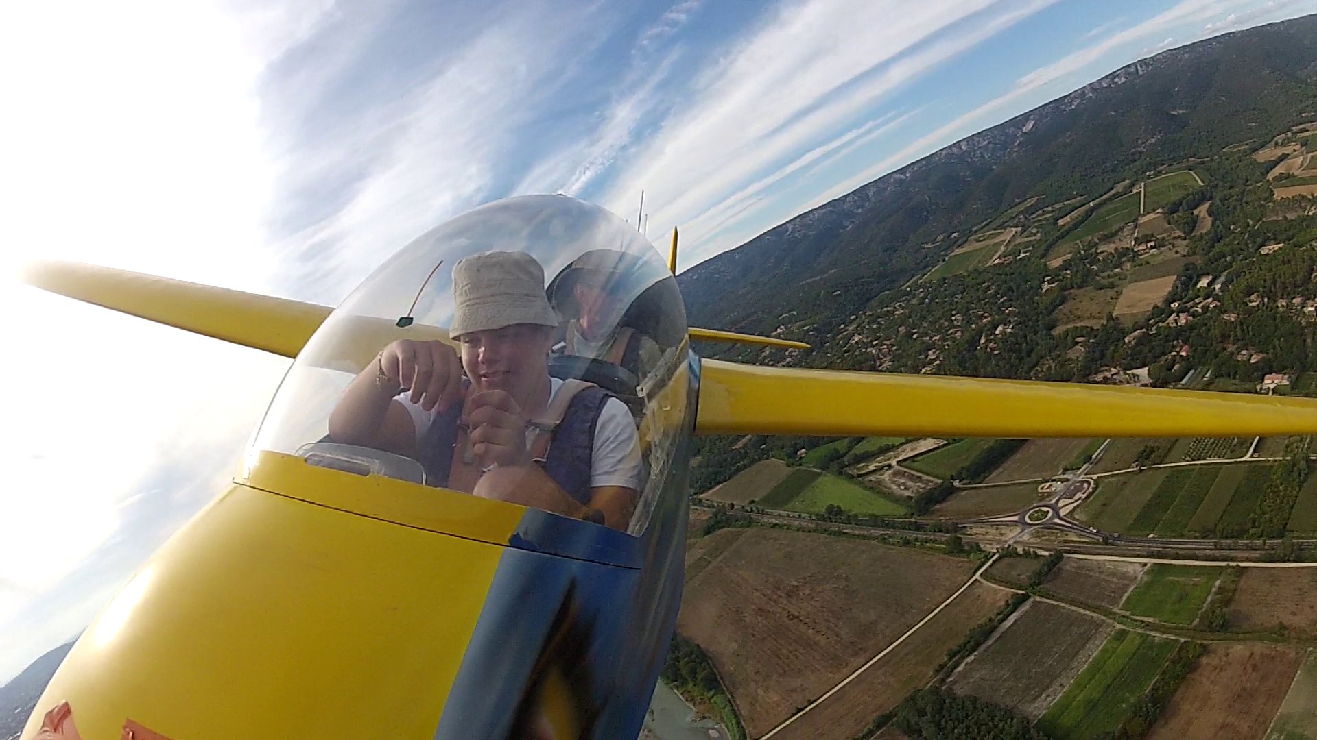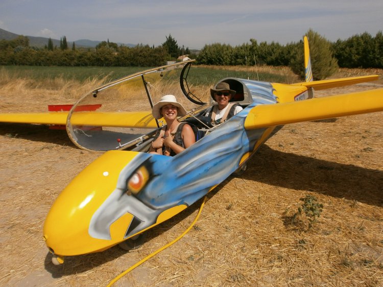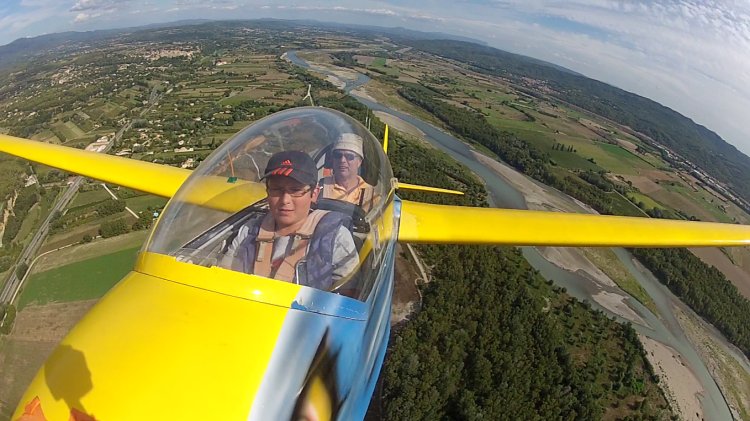 Une chaude journée ce 22 juillet. Marion et Benjamin sont venus à Vinon pour leur 1er vol en planeur. Une belle expérience pour chacun d'eux ; ils ont volé pendant une heure au dessus des basses gorges du Verdon et sur le Luberon. Marion a même expérimenté les prémices du pilotage en prenant les commandes de Manosque à l'étang de la Bonde.