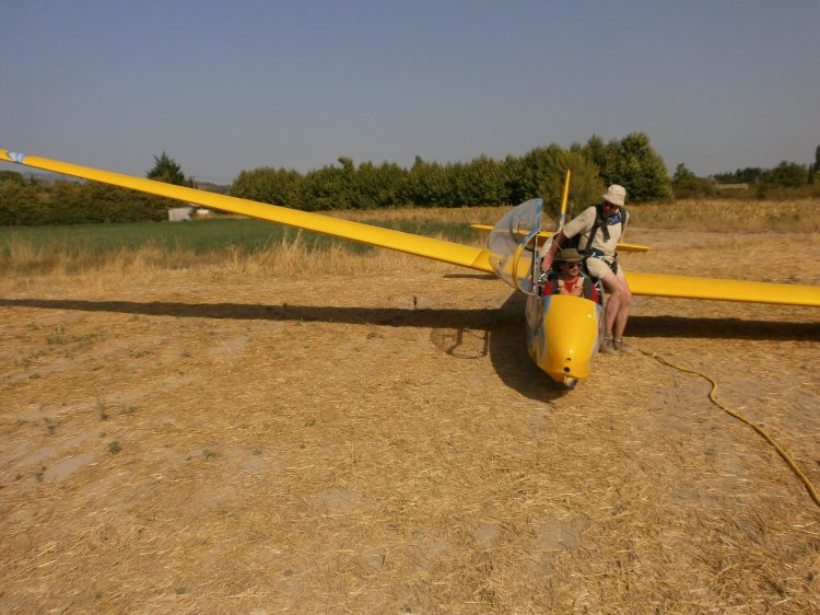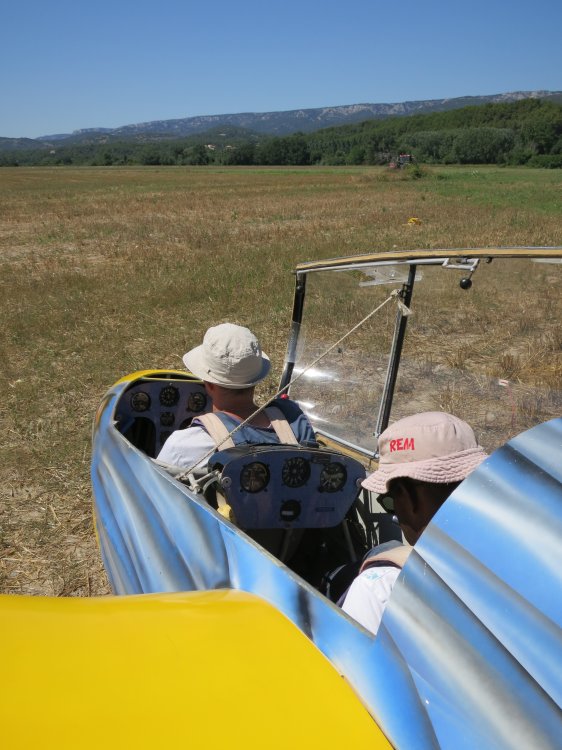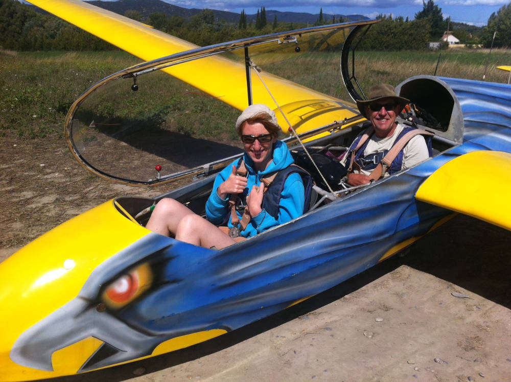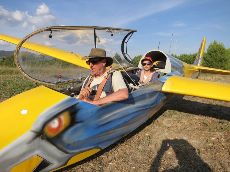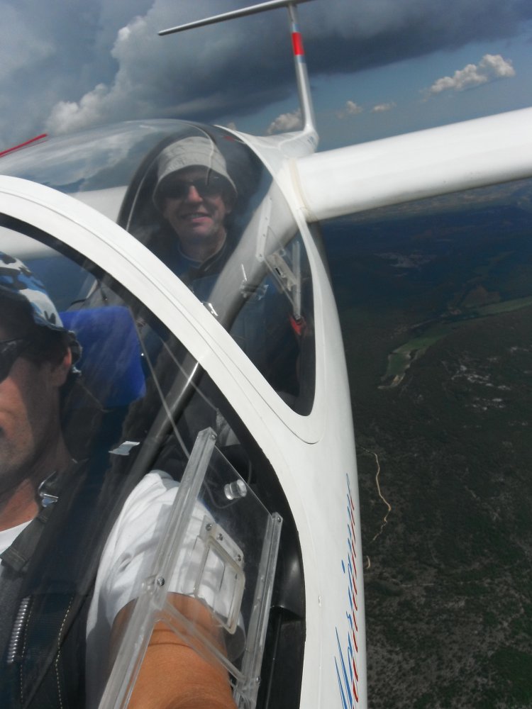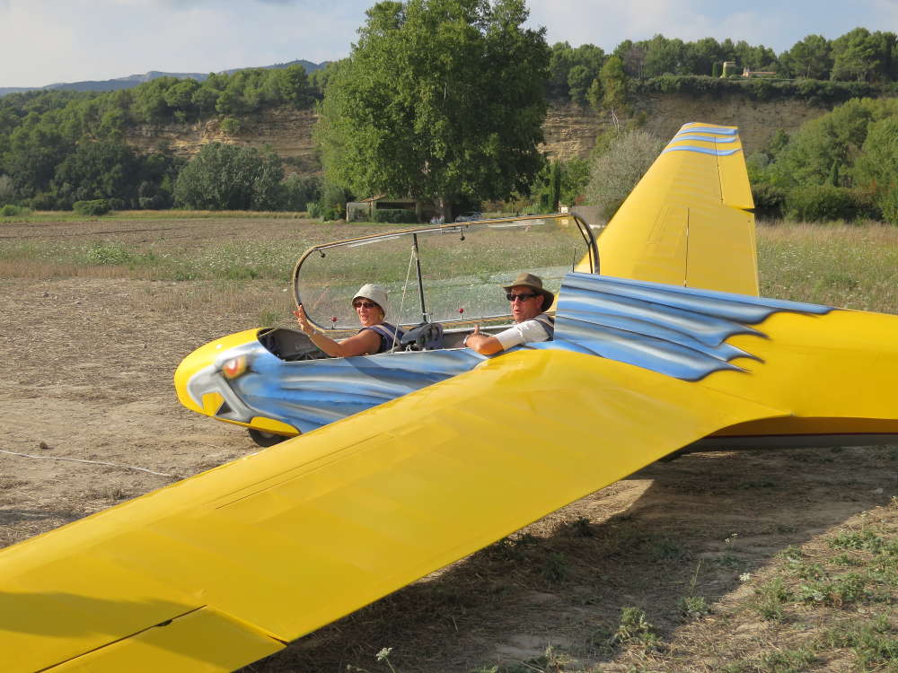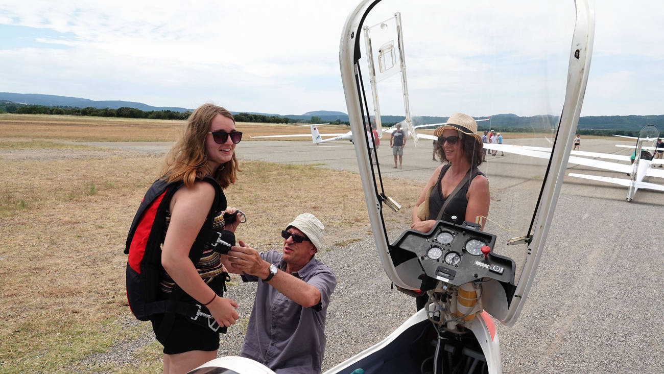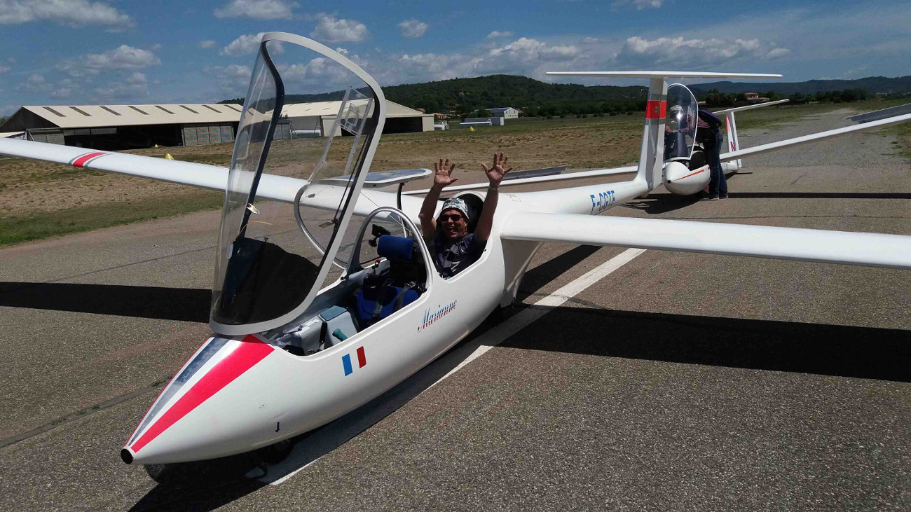 Une chaude journée ce 22 juillet. Marion et Benjamin sont venus à Vinon pour leur 1er vol en planeur. Une belle expérience pour chacun d'eux ; ils ont volé pendant une heure au dessus des basses gorges du Verdon et sur le Luberon. Marion a même expérimenté les prémices du pilotage en prenant les commandes de Manosque à l'étang de la Bonde.