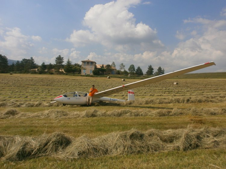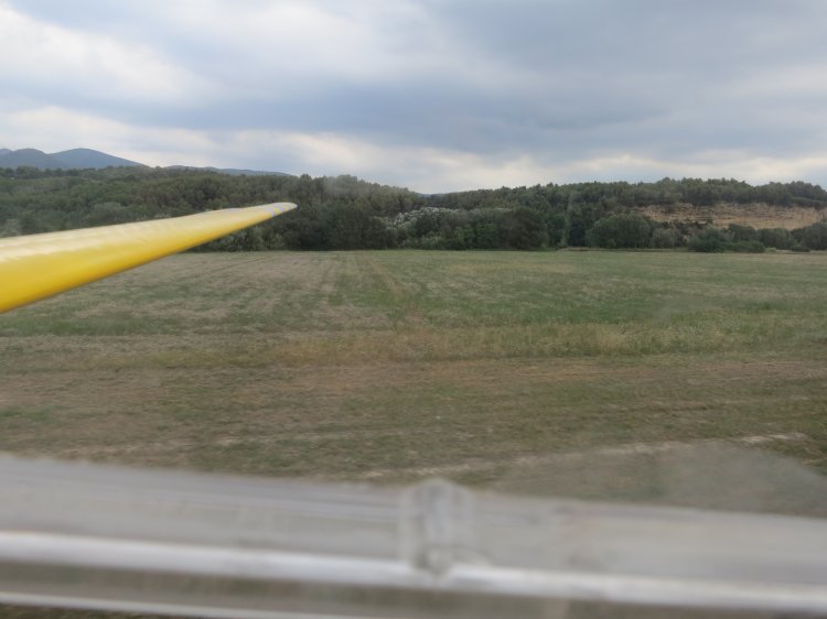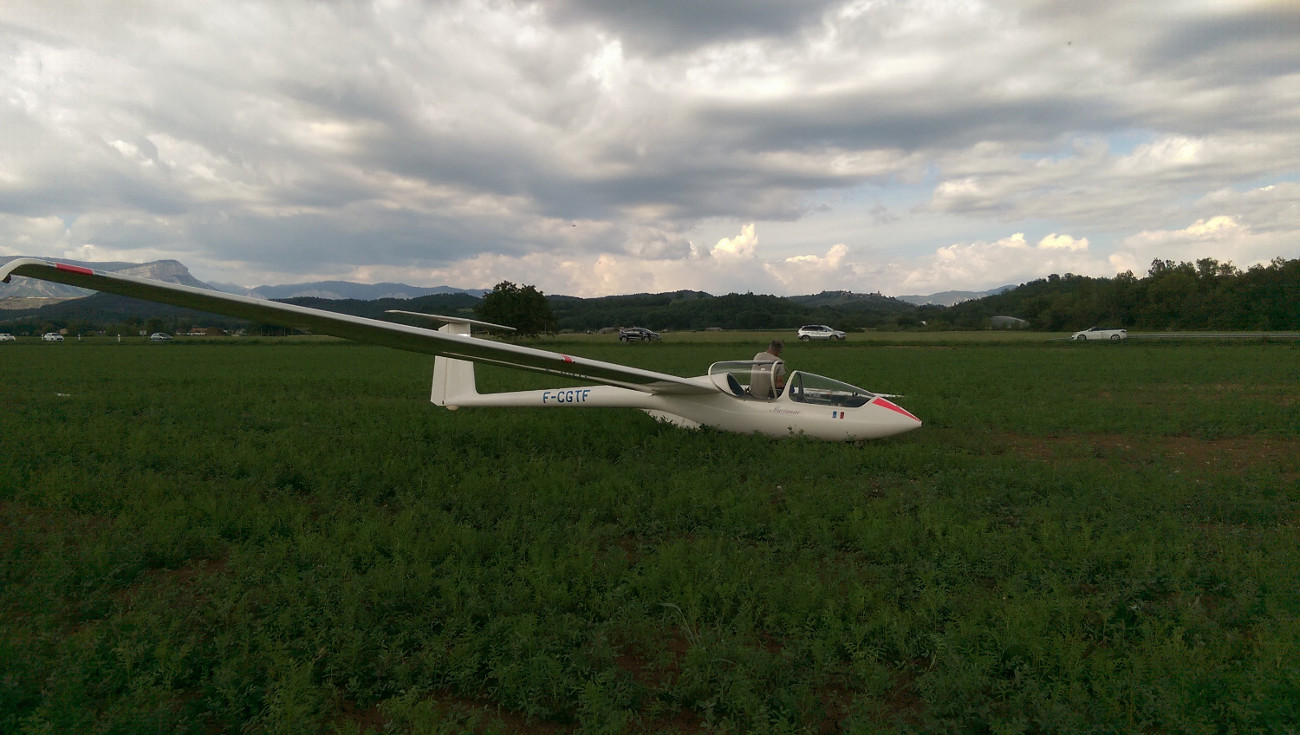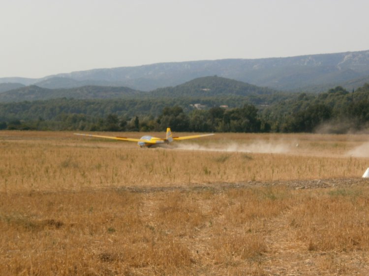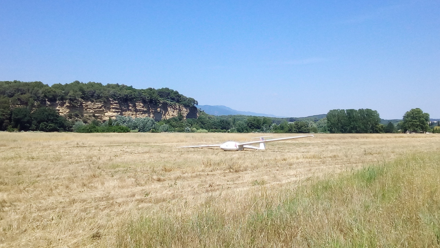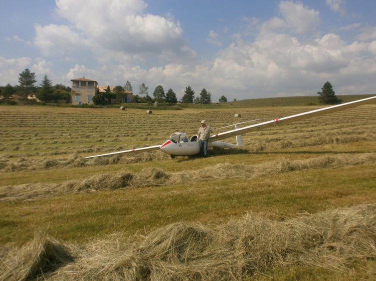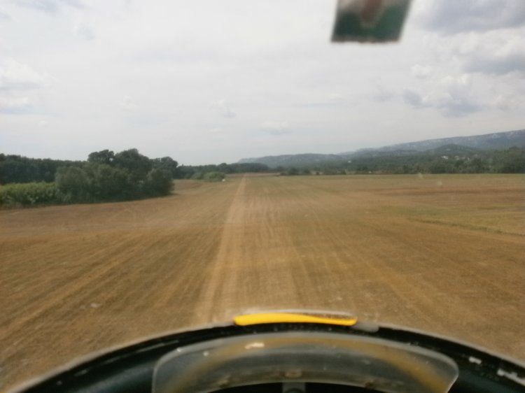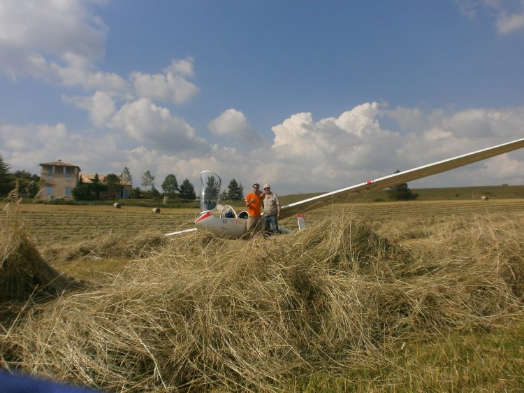 Pas trop haut, pas trop près comme me l'a appris Régis l'année dernière à Vinon, check list d'atterrissage et j'entame ma vent arrière ; maintenant la base puis la finale ... ça se présente bien. Et peu avant l'arrondi, oh surprise c'est un champ de sainfoin de 60 à 70 cm de hauteur ; gaffe au cheval de bois ... les ailes bien à plat. Bon il faut y aller, se laisser descendre dans la mer verte. Arrêt très rapide mais pas de casse, pas de bobo.