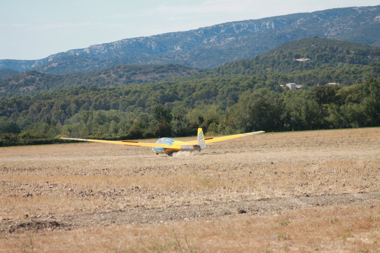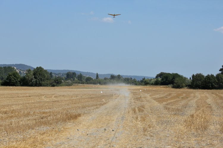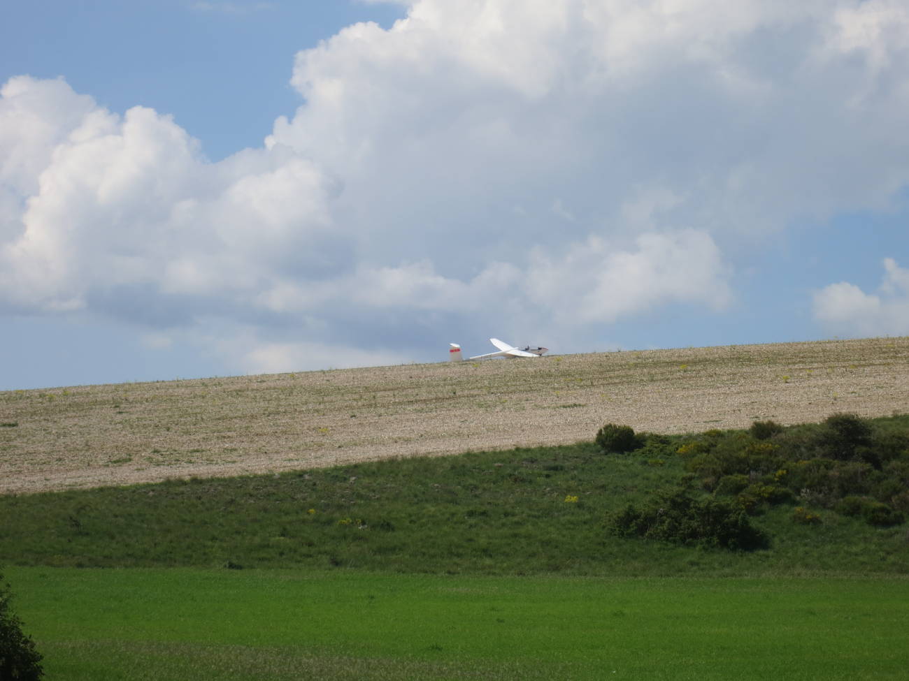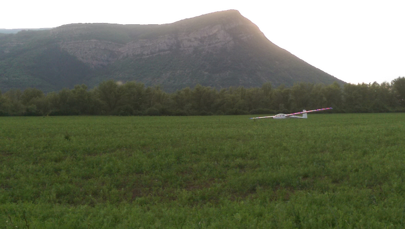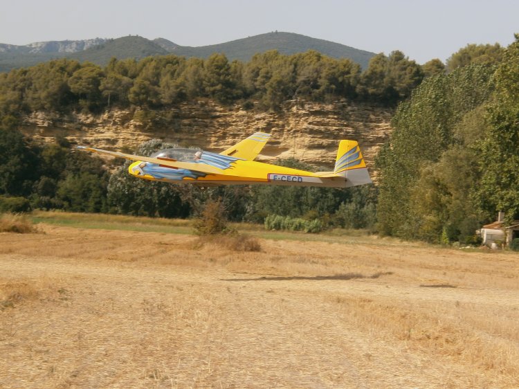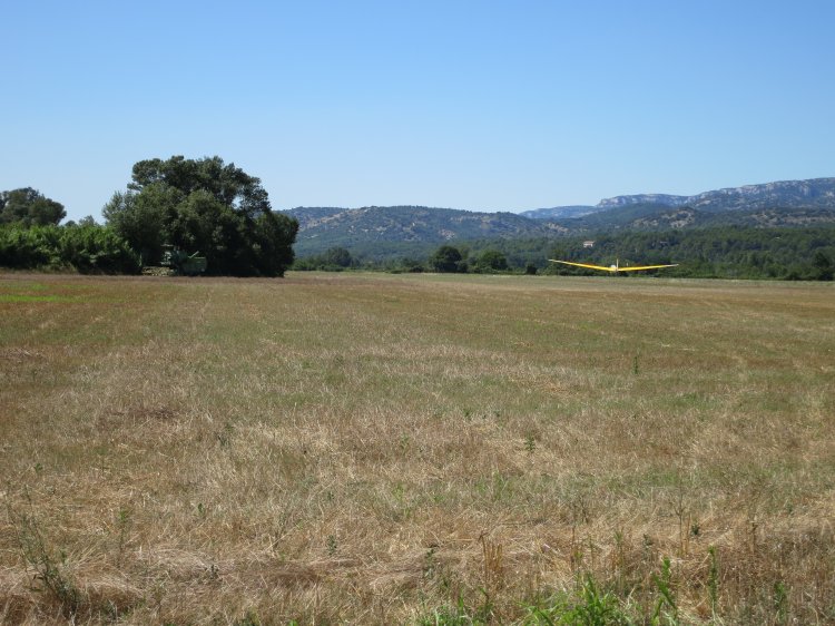 Pas trop haut, pas trop près comme me l'a appris Régis l'année dernière à Vinon, check list d'atterrissage et j'entame ma vent arrière ; maintenant la base puis la finale ... ça se présente bien. Et peu avant l'arrondi, oh surprise c'est un champ de sainfoin de 60 à 70 cm de hauteur ; gaffe au cheval de bois ... les ailes bien à plat. Bon il faut y aller, se laisser descendre dans la mer verte. Arrêt très rapide mais pas de casse, pas de bobo.