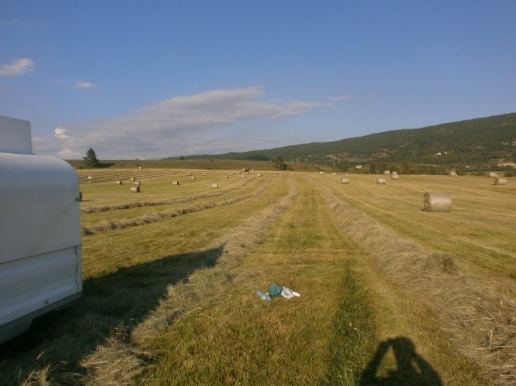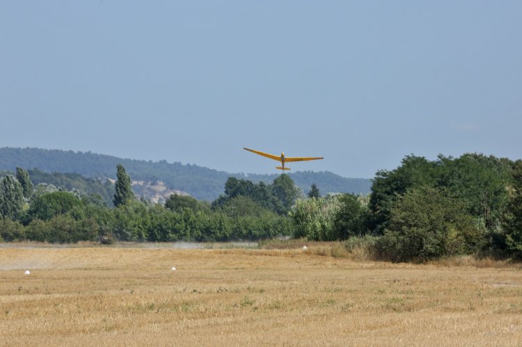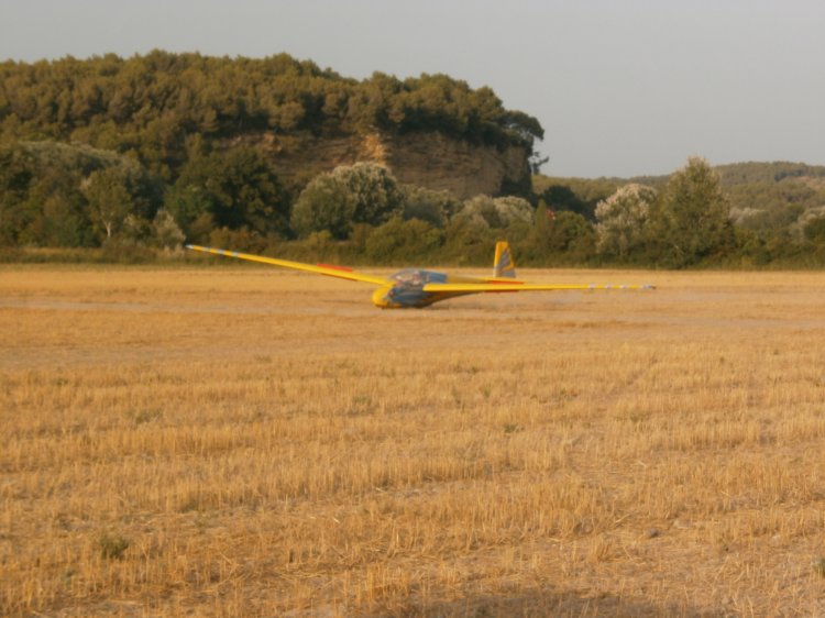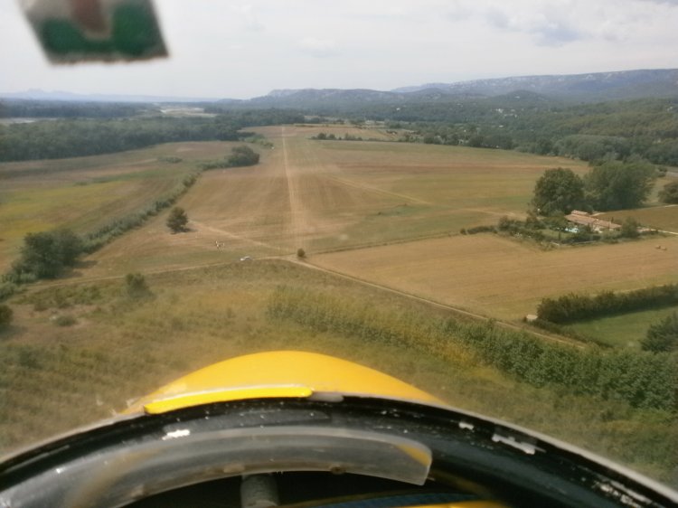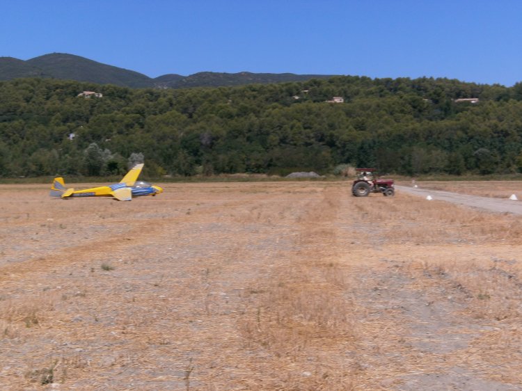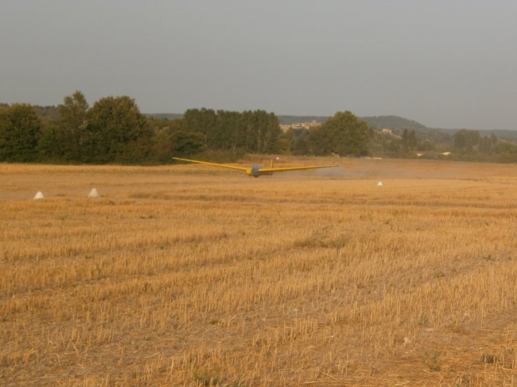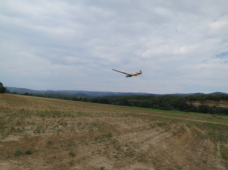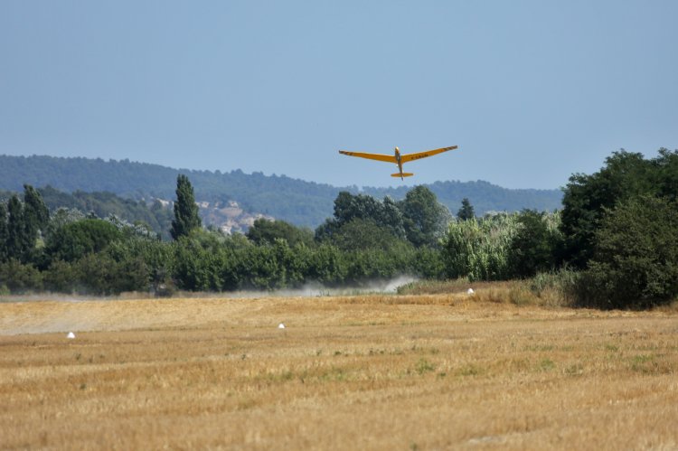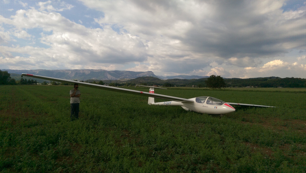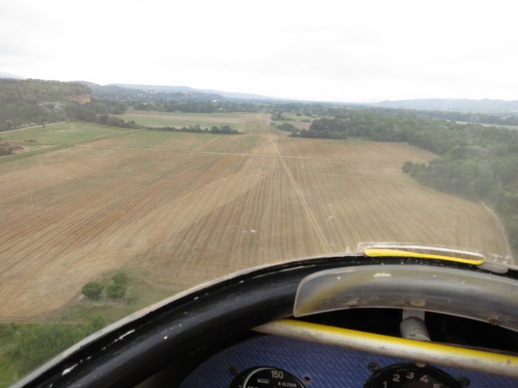 Pas trop haut, pas trop près comme me l'a appris Régis l'année dernière à Vinon, check list d'atterrissage et j'entame ma vent arrière ; maintenant la base puis la finale ... ça se présente bien. Et peu avant l'arrondi, oh surprise c'est un champ de sainfoin de 60 à 70 cm de hauteur ; gaffe au cheval de bois ... les ailes bien à plat. Bon il faut y aller, se laisser descendre dans la mer verte. Arrêt très rapide mais pas de casse, pas de bobo.