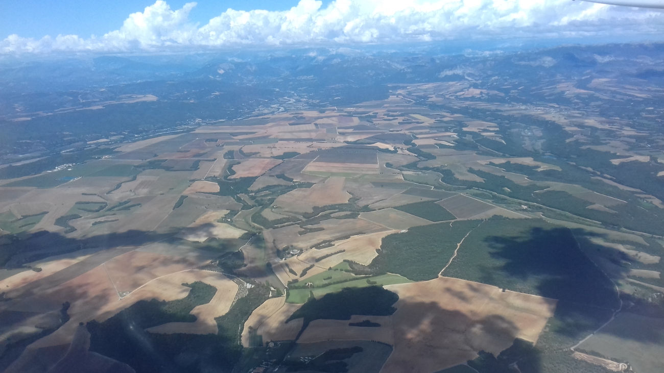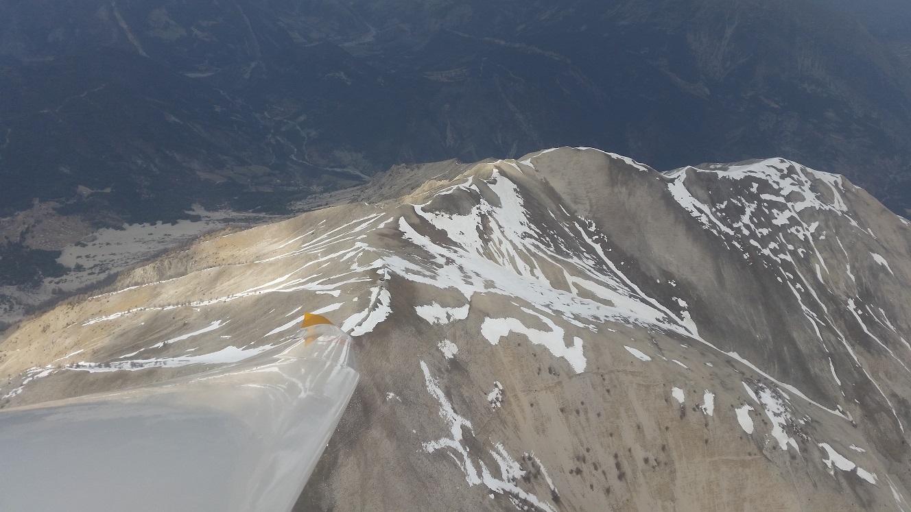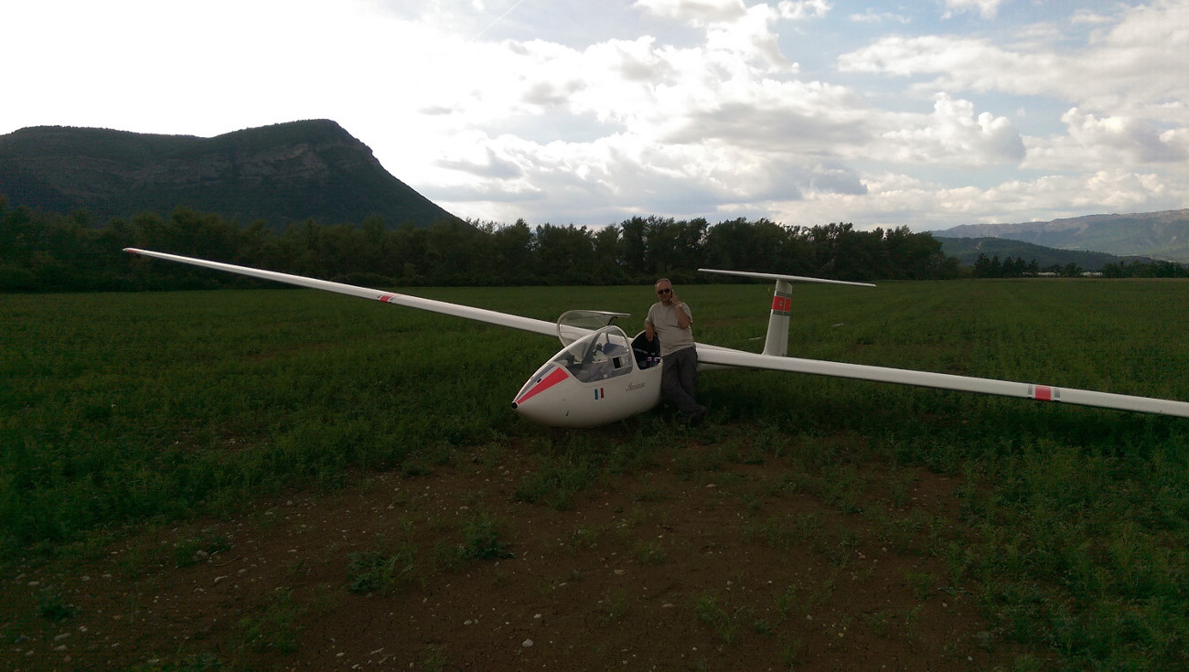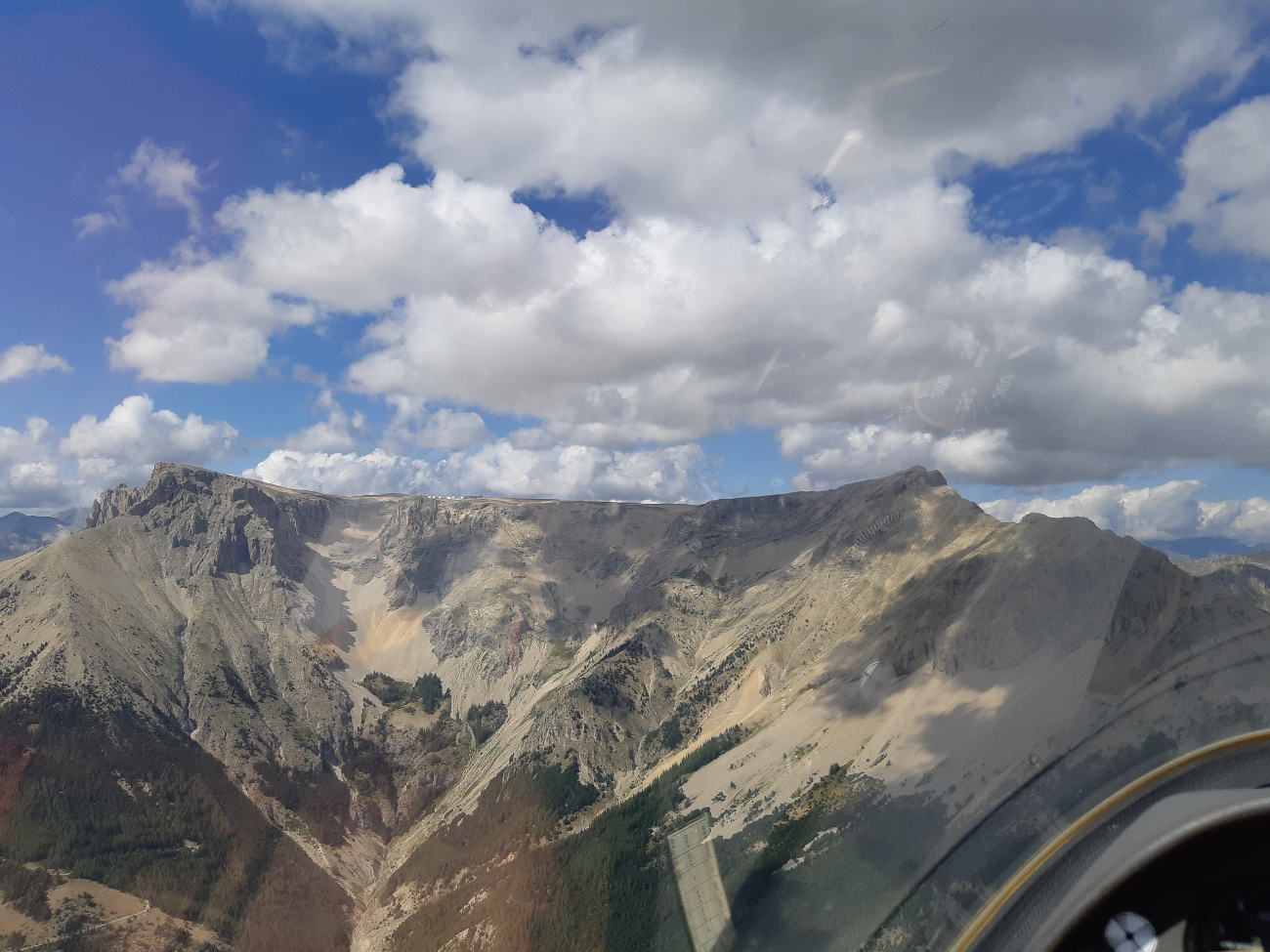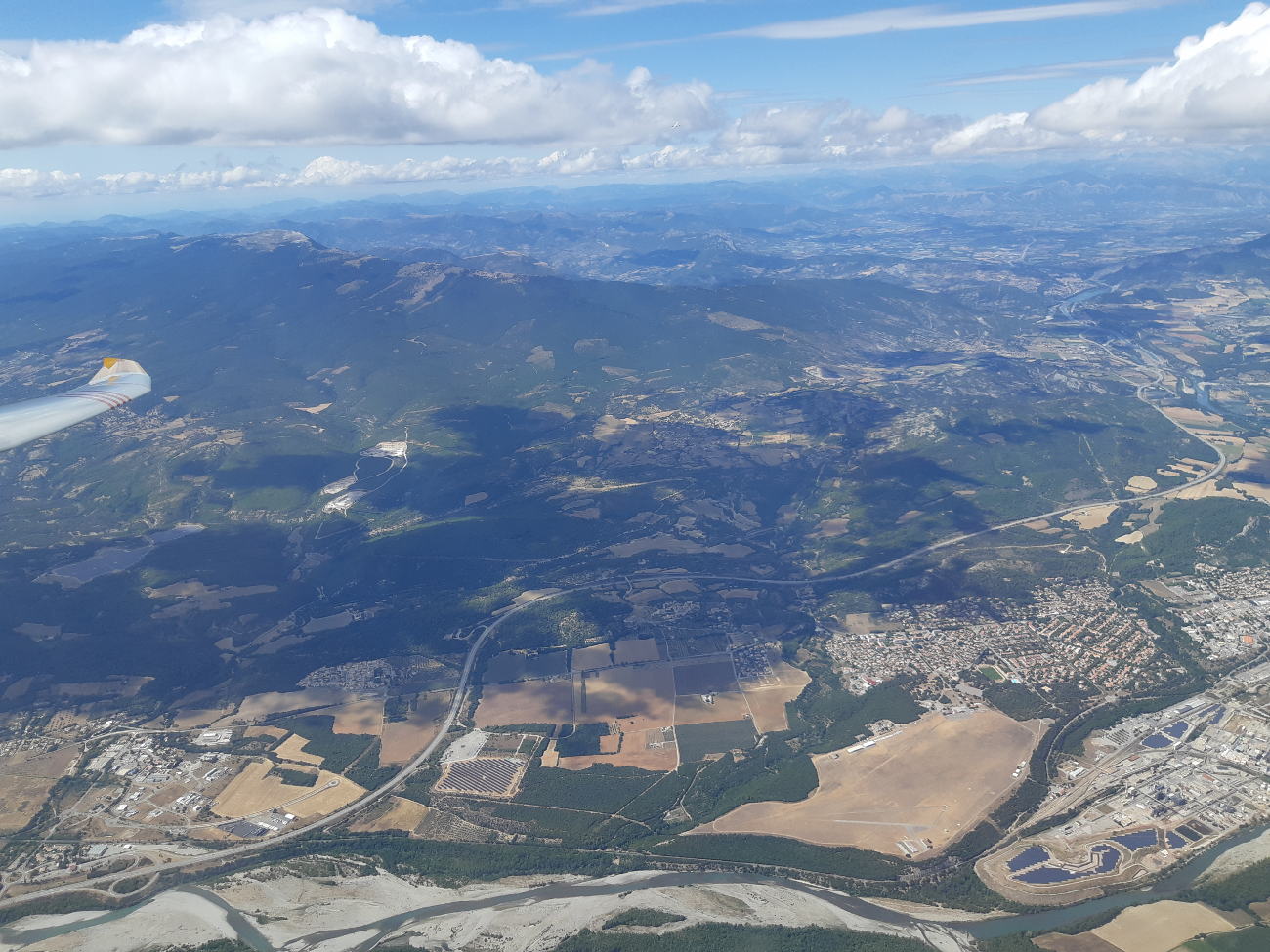 Une bonne météo, des cumulus, un vent du sud-est, alors aujourd'hui Philippe et Alain ont décidé d'aller vers Gap. Depuis Carpentras à bord du Marianne, cap au nord-est. Aspres puis le pic de Bure mais les conditions ne sont pas à la hauteur des attentes des circuiteurs ... trop de temps passé à reprendre de l'altitude, il faut rentrer. Et les conditions sont de moins en moins bonnes. Le vario reste désespérement dans le négatif, impossible d'atteindre l'aérodrome ... il faut se résoudre à atterrir ... ça s'appelle une belle vache. C'est Daniel qui assurera le retour à Pernes.